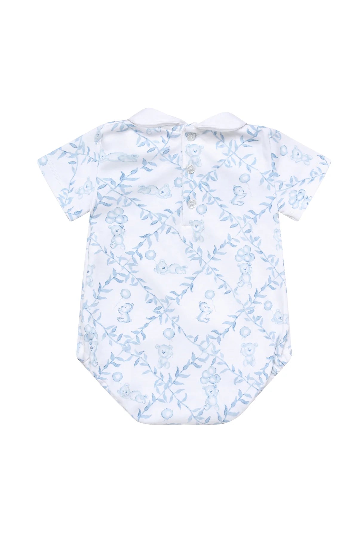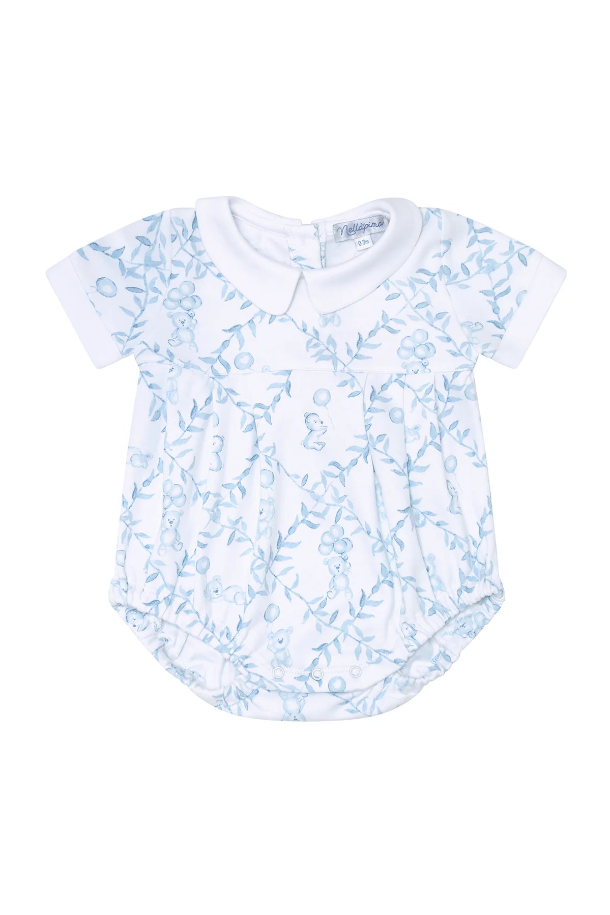 Make your baby's outfit both appealing and comfortable with the Blue Bears Trellace bubble! Featuring an adorable blue bear trellace design, this outfit is not only cute but also highly practical. With a snap leg closure and an adjustable button behind the collar, it's perfect for everyday wear. Plus, the Peruvian Pima cotton fiber adds a touch of softness and shine to the fabric, ensuring your baby stays comfortable and cozy all day long. Picot trim detail around the collar.  The properties of this fiber create a more durable fabric that gives our clothes that unparalleled luxurious touch that is so highly desired.