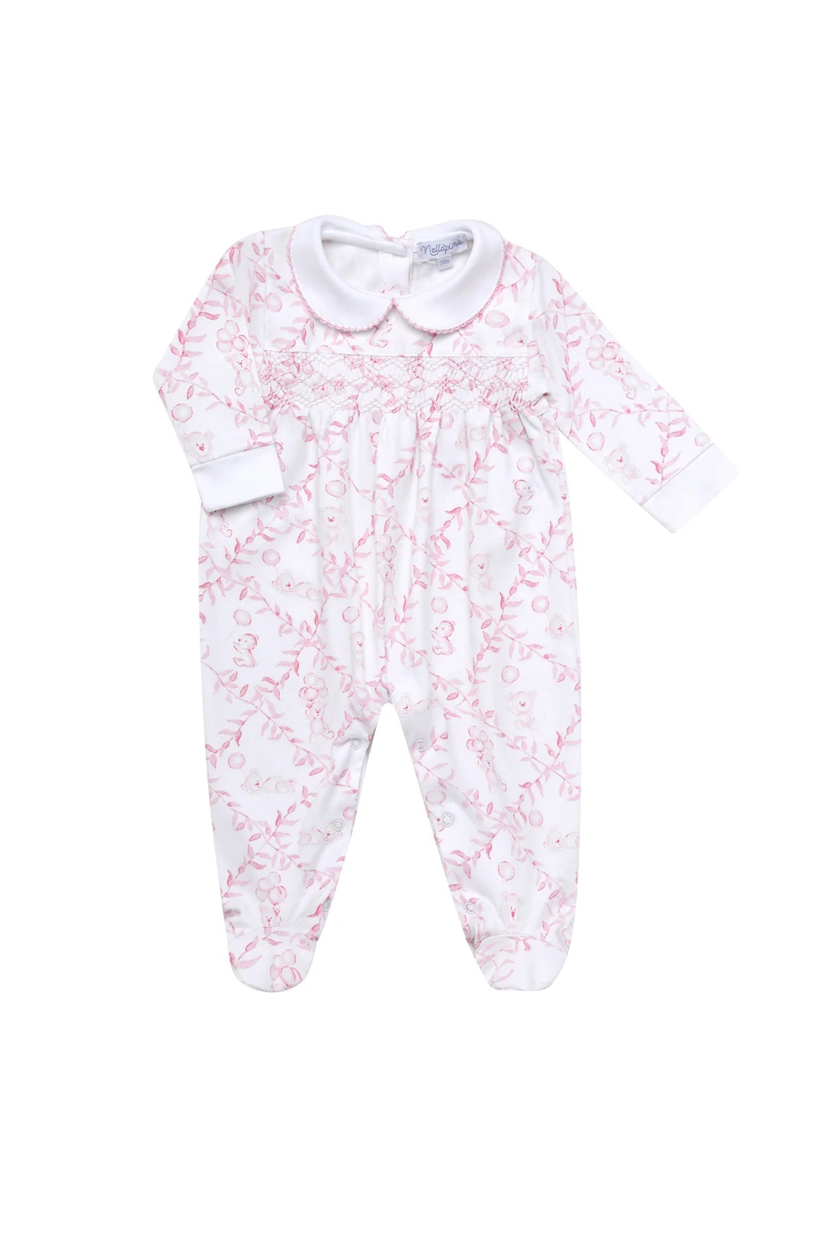 Our beautiful smocked footie comes with an imprinted design and smocked detailing. It has also a ruffled collar, snap leg closure, and an adjustable button behind the collar. Made with 100% Peruvian Pima cotton makes this footie a comfortable and durable infant wear piece. This footie allows your baby to crawl, walk, sleep and cuddle without any hassle. The properties of this fiber create for a more durable fabric, that gives it its unparalleled luxurious touch that is most desired.