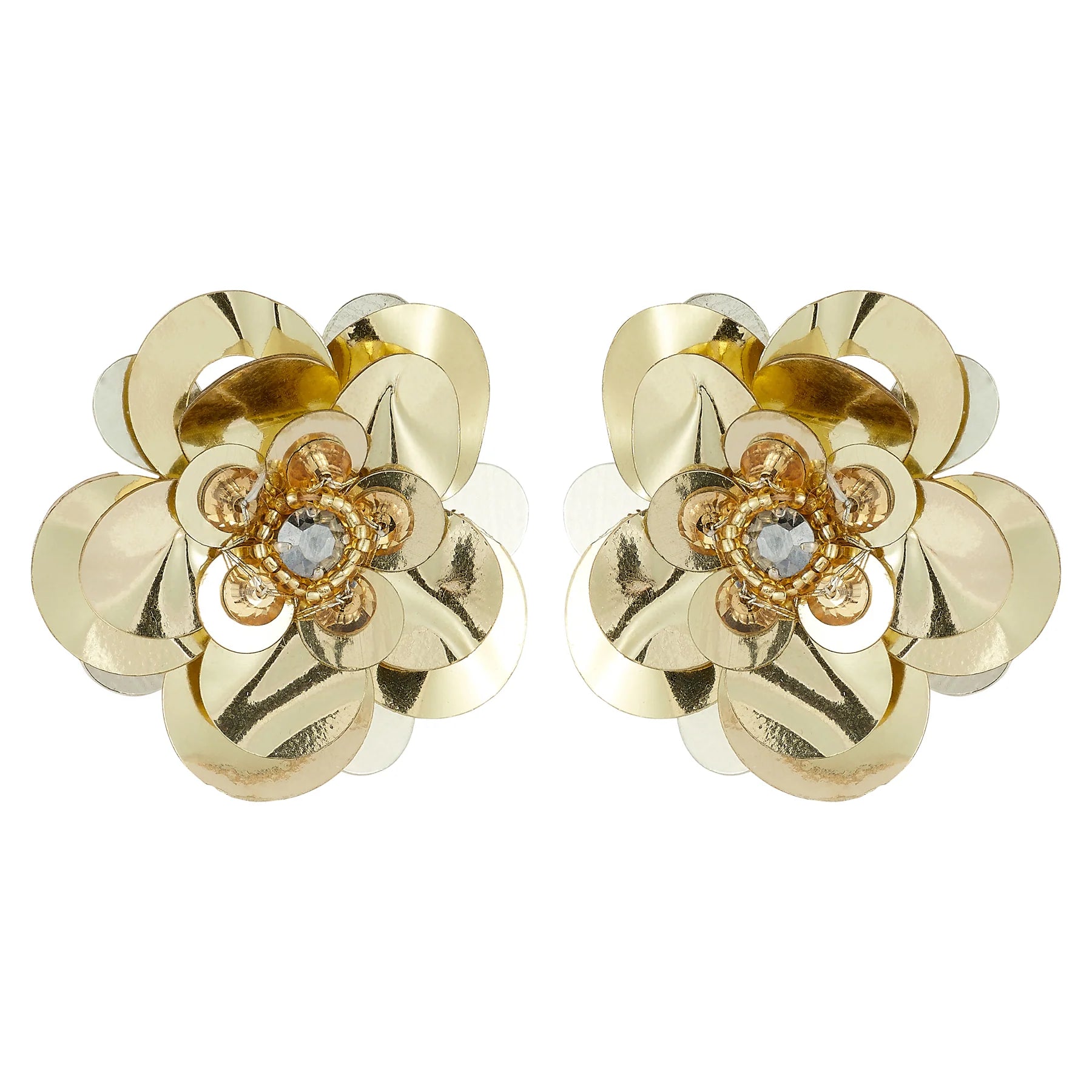 Bold yet feminine, these gold flower earrings feature layered gold sequin petals with a sparkling crystal center. Lightweight and eye-catching, they're the perfect statement earrings for both day and evening looks.