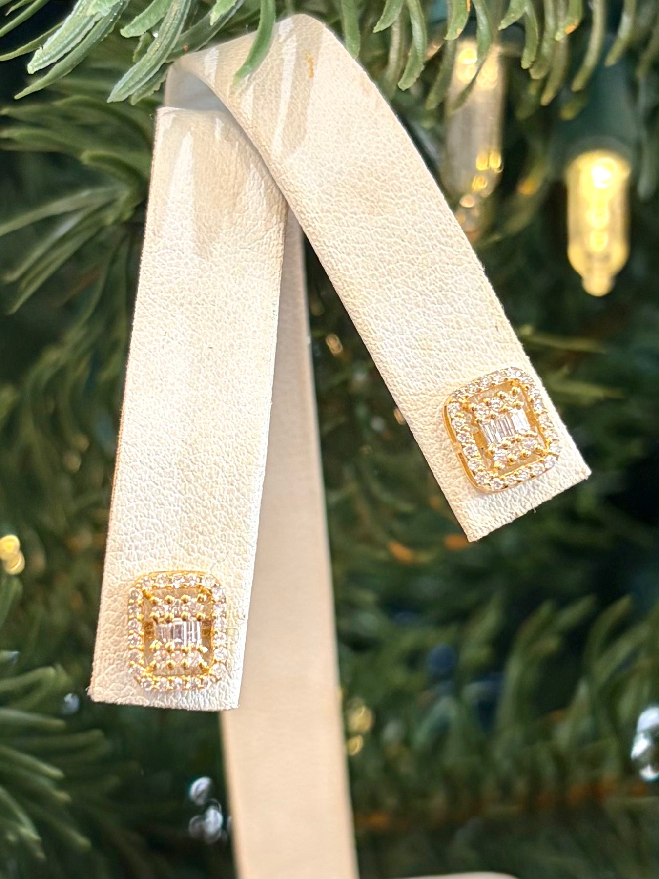 A regal, radiant design, these dazzling diamond earrings complement any attire. Fashioned in sleek 14K gold, each earring features a trio of baguette-cut diamonds at the center. Bordered top and bottom with round diamonds, these center clusters are framed with additional round diamonds for even more sparkle. Glistening with an impressive 1/3 ct. t.w. of diamonds and a bright polished shine, these post earrings secure comfortably with friction backs.