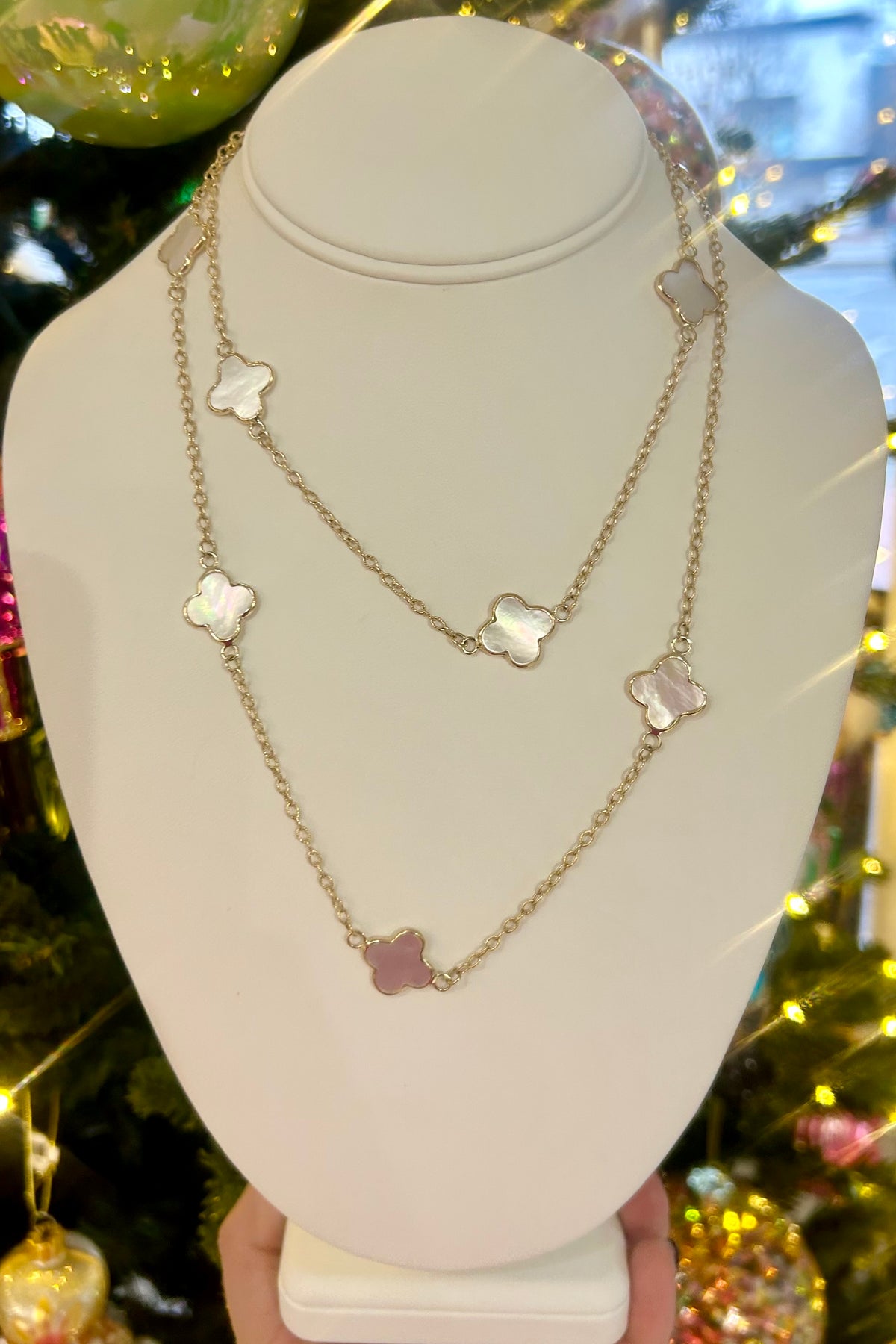 This versatile and elegant 14kt Mother of Pearl Clover Necklace features stunning clover pendants with delicate detailing and shimmering mother of pearl inlay. Wear it long for a sophisticated look or layer it wrapped around your neck for a chic touch. Elevate any outfit with this timeless and luxurious piece.