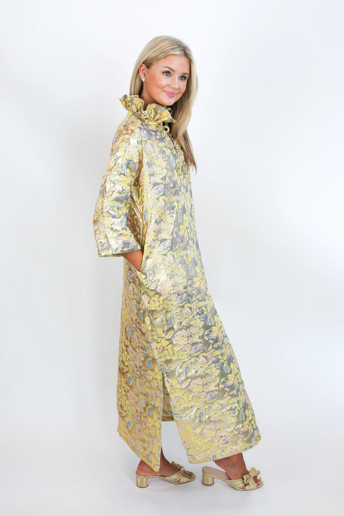 Crafted from the most exquisite gold brocade fabric, it features a high ruffle collar, elegant gold frog closures, and a soft pink taffeta lining. With its refined construction and vintage glam design, Catherine is the perfect dress for any special event.