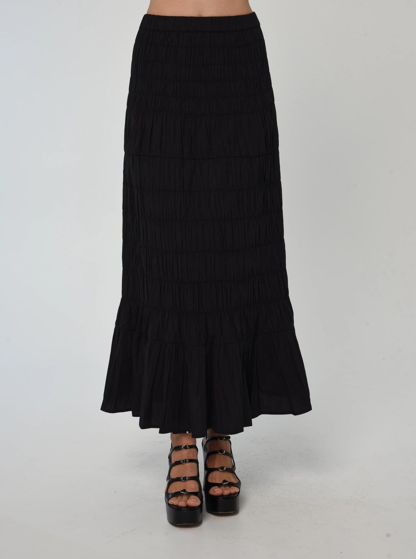 Kelly Skirt in Black is a wardrobe staple! Designed with smocking throughout the body and a comfortable encased elasticwaistband.