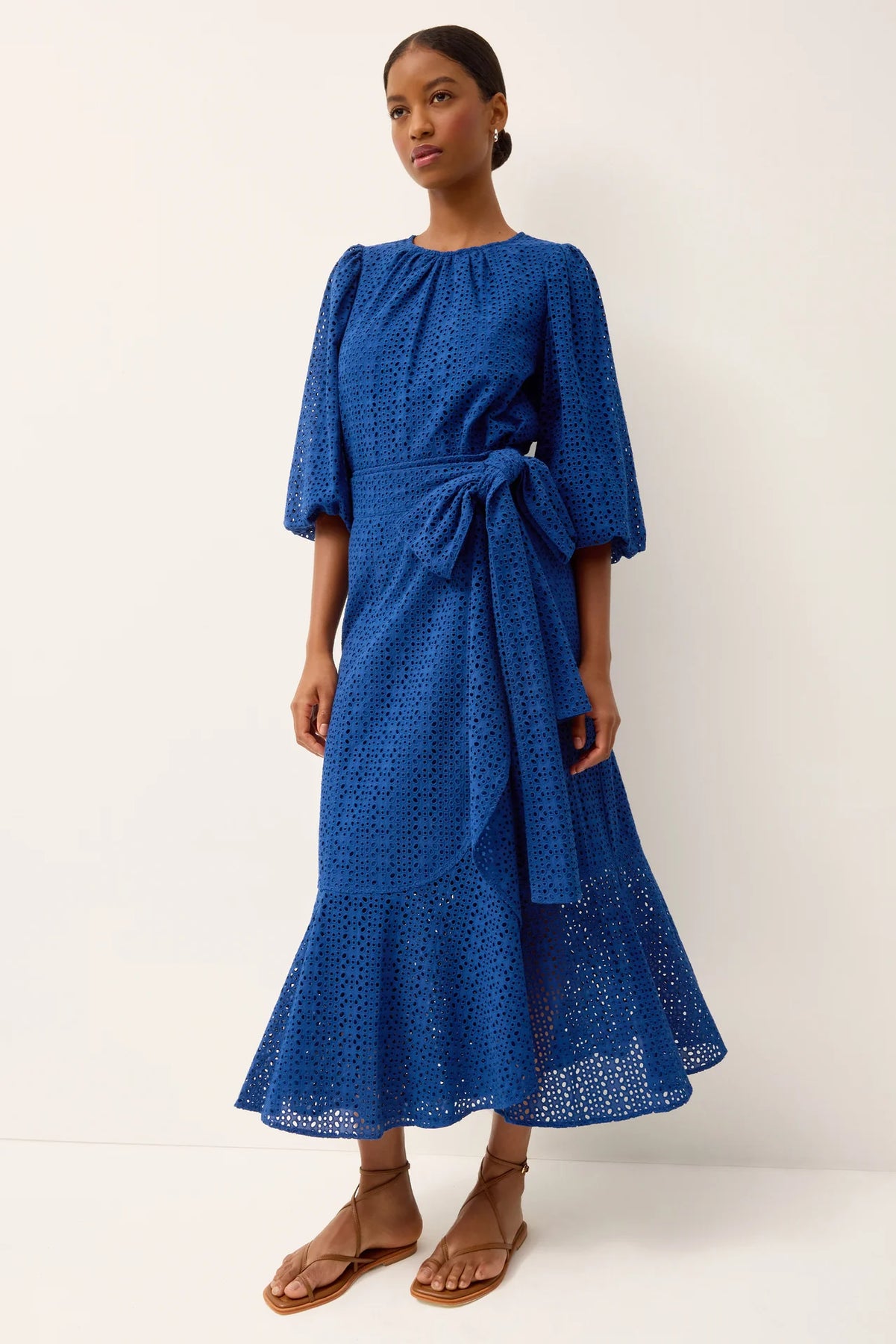 Simple yet elegant, this slip-on style is a fan favorite for its striking, three-quarter-length balloon sleeves and flattering gathered neckline. Harly is pictured here in bold Amiral blue, which stands out for its all-over floral embroidery.