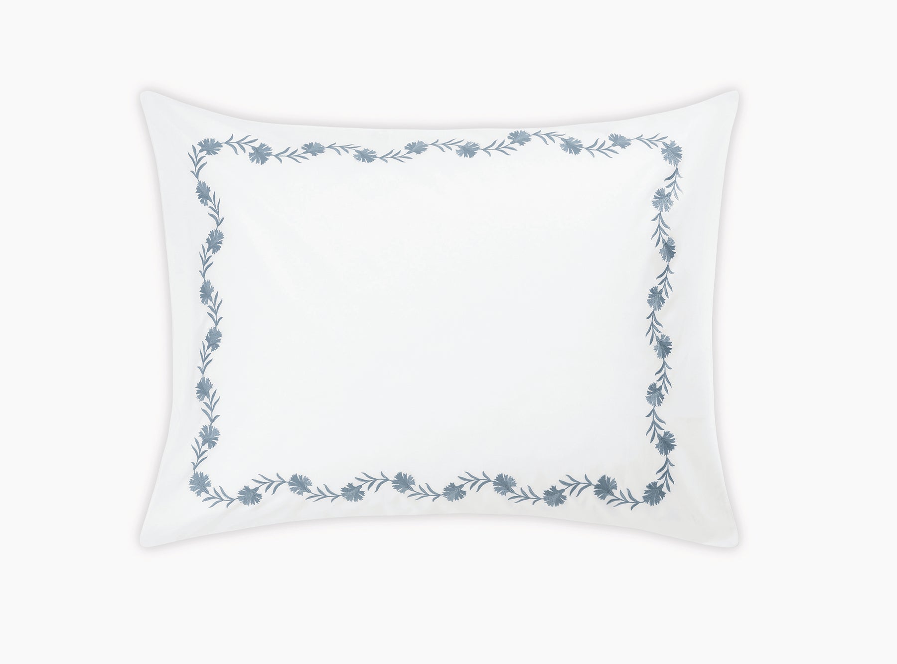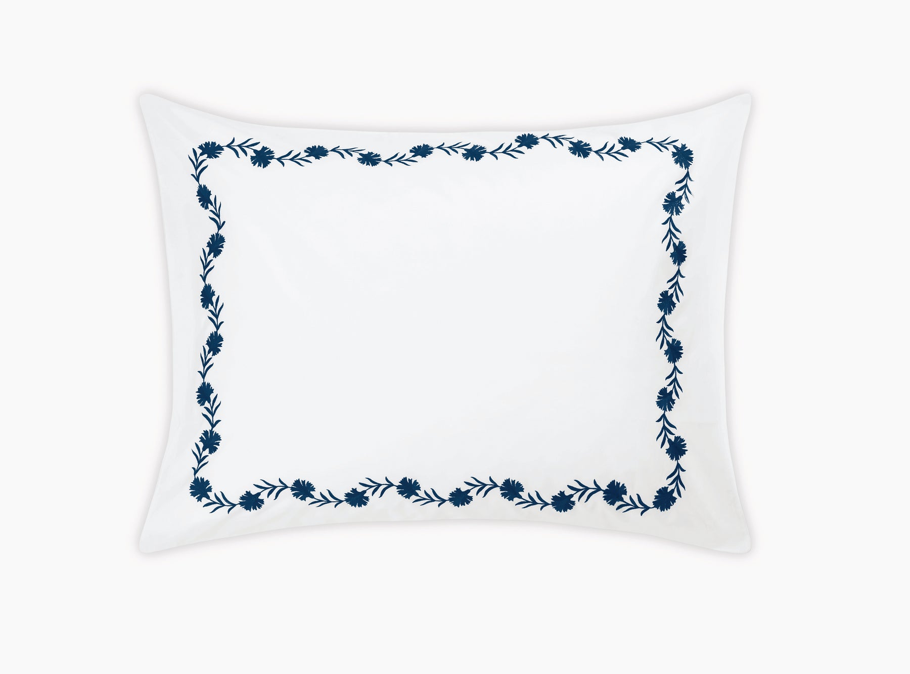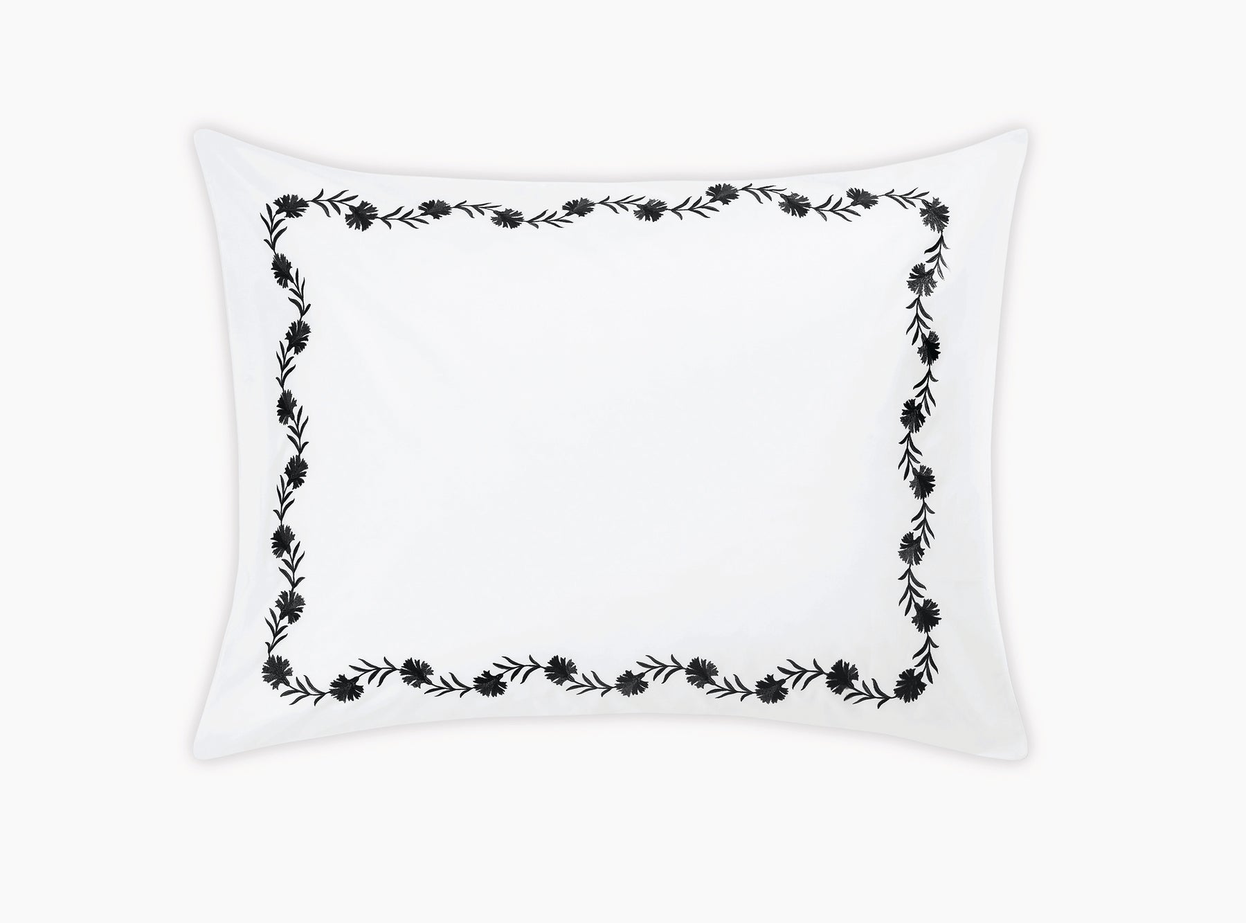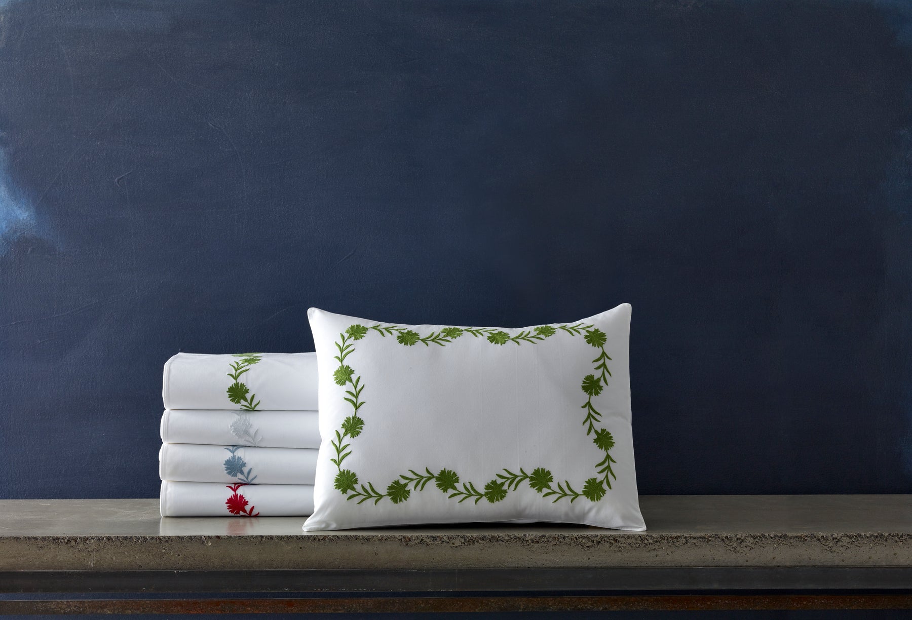 Daphne’s embroidered floral vine is a beautifully crafted detail that, depending on your choice of thread color, can be quietly classic or vibrant and bold. Made on white 520 thread count Ceylon percale, each piece is finished with a knife edge and delicate white cording.