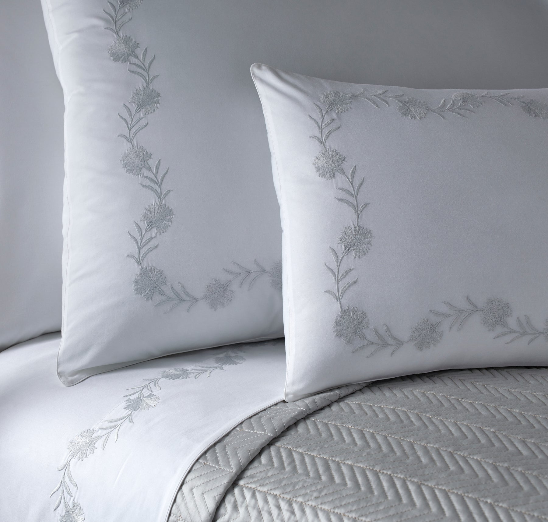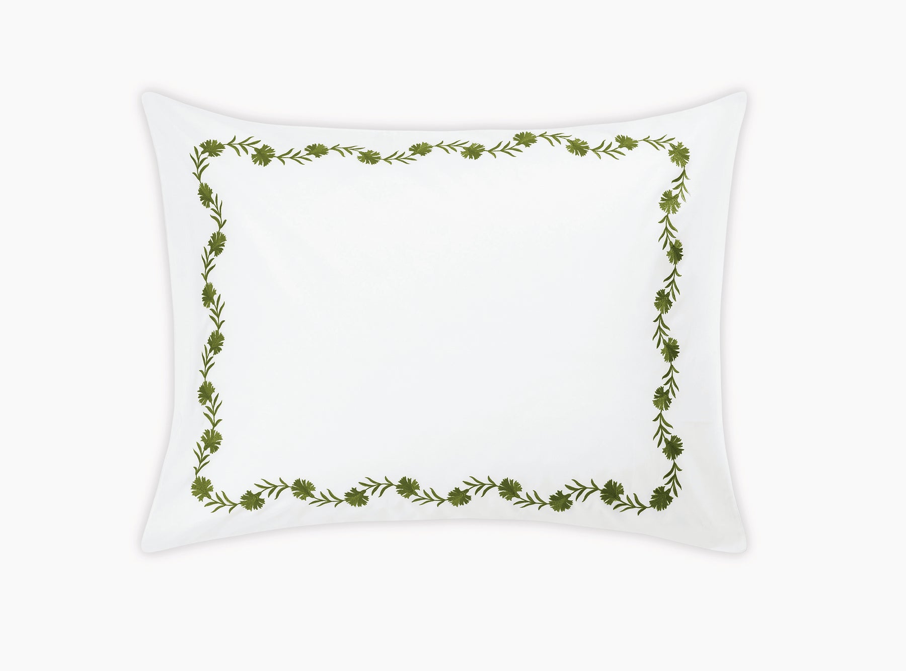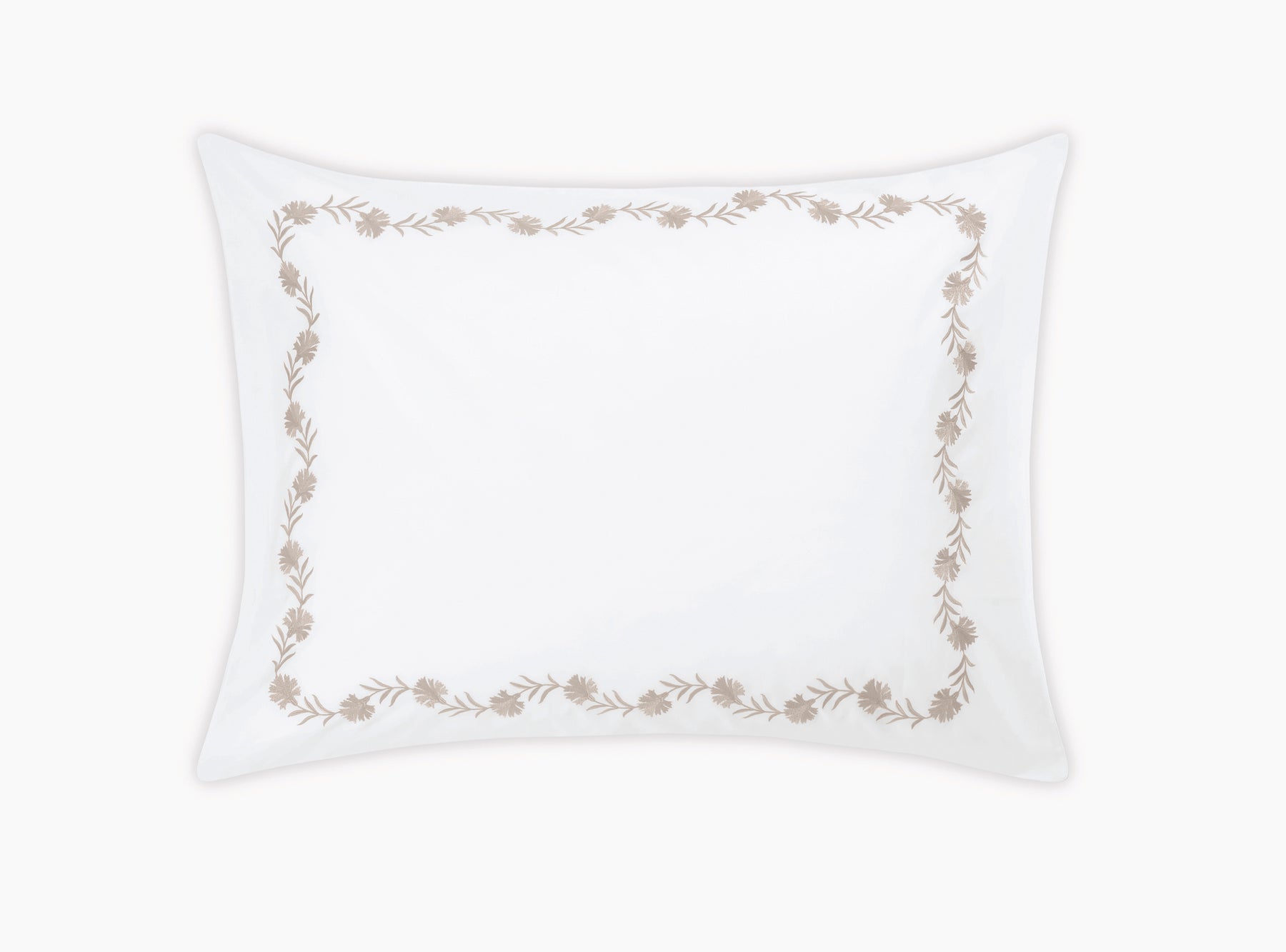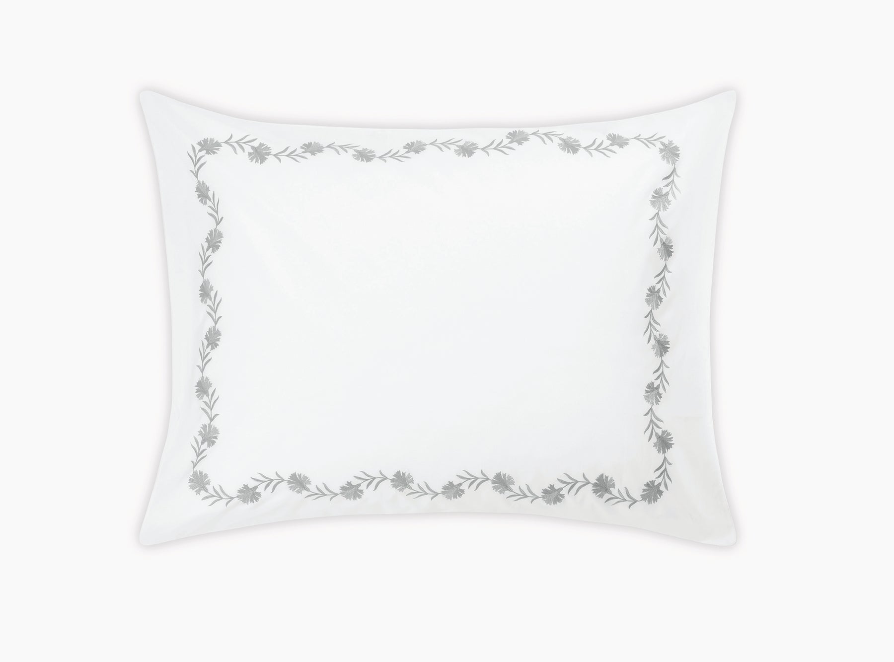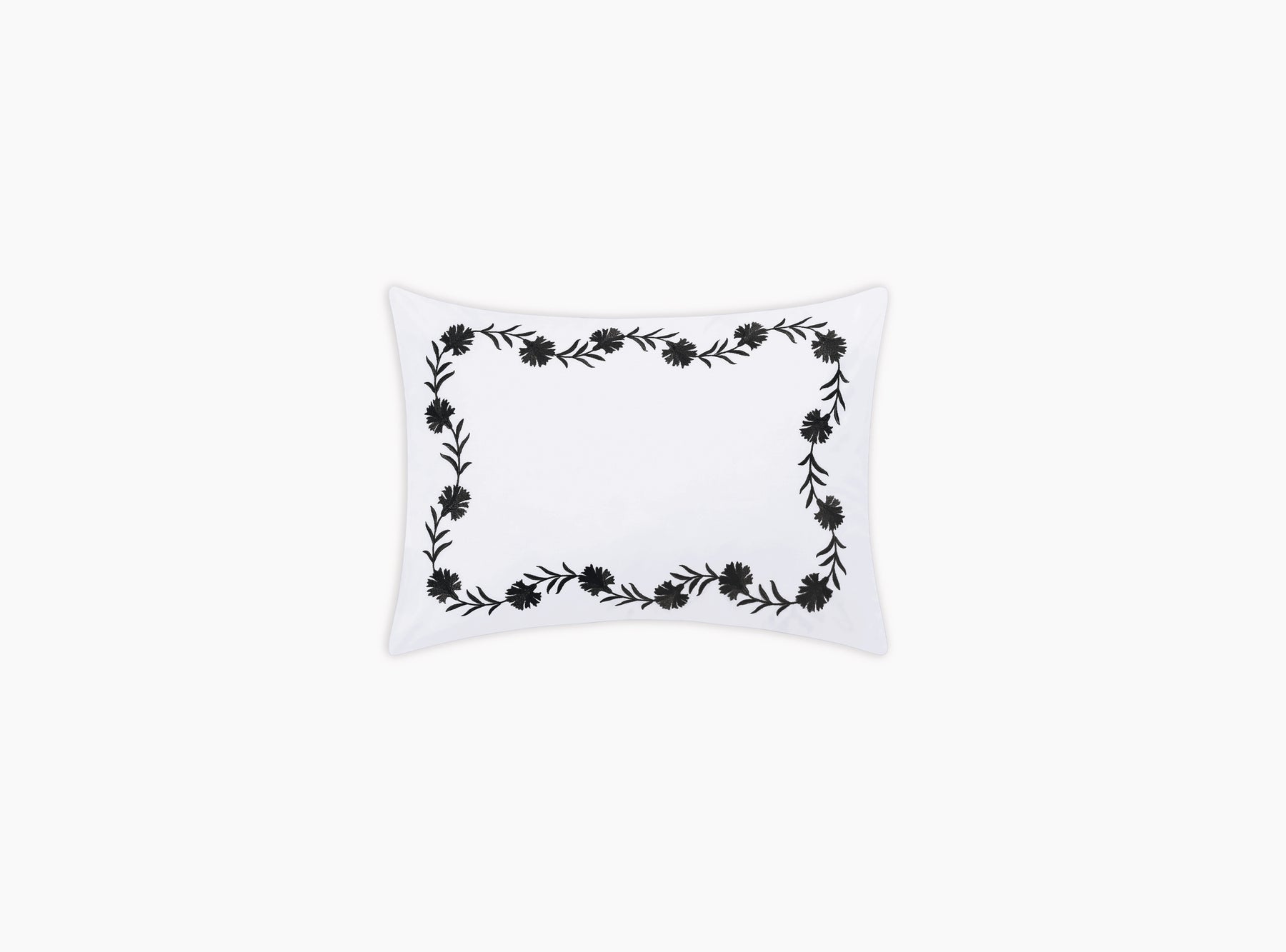 Daphne’s embroidered floral vine is a beautifully crafted detail that, depending on your choice of thread color, can be quietly classic or vibrant and bold. Made on white 520 thread count Ceylon percale, each piece is finished with a knife edge and delicate white cording.
