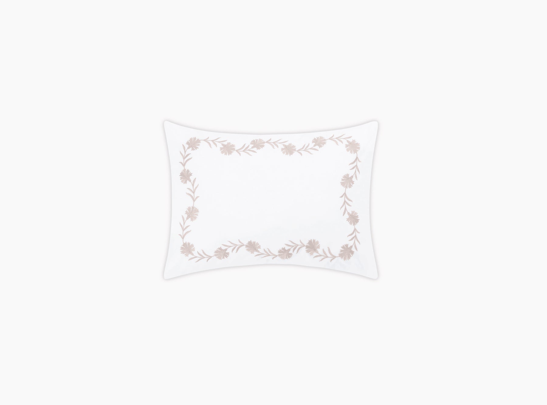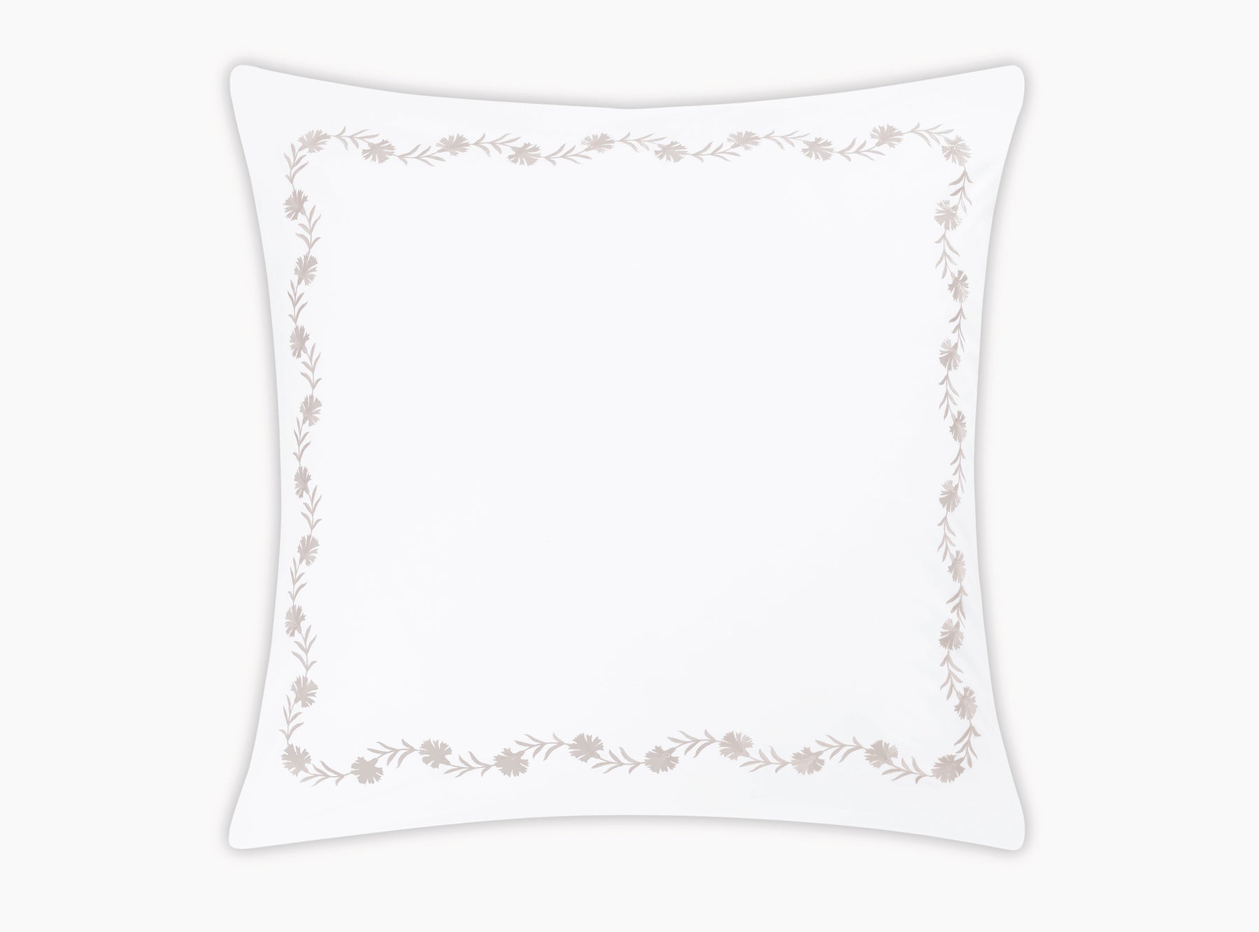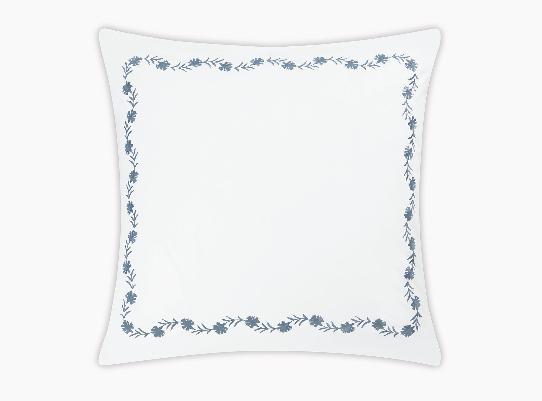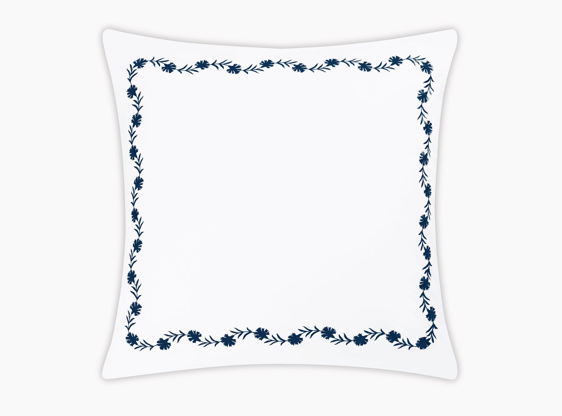 Daphne’s embroidered floral vine is a beautifully crafted detail that, depending on your choice of thread color, can be quietly classic or vibrant and bold. Made on white 520 thread count Ceylon percale, each piece is finished with a knife edge and delicate white cording.