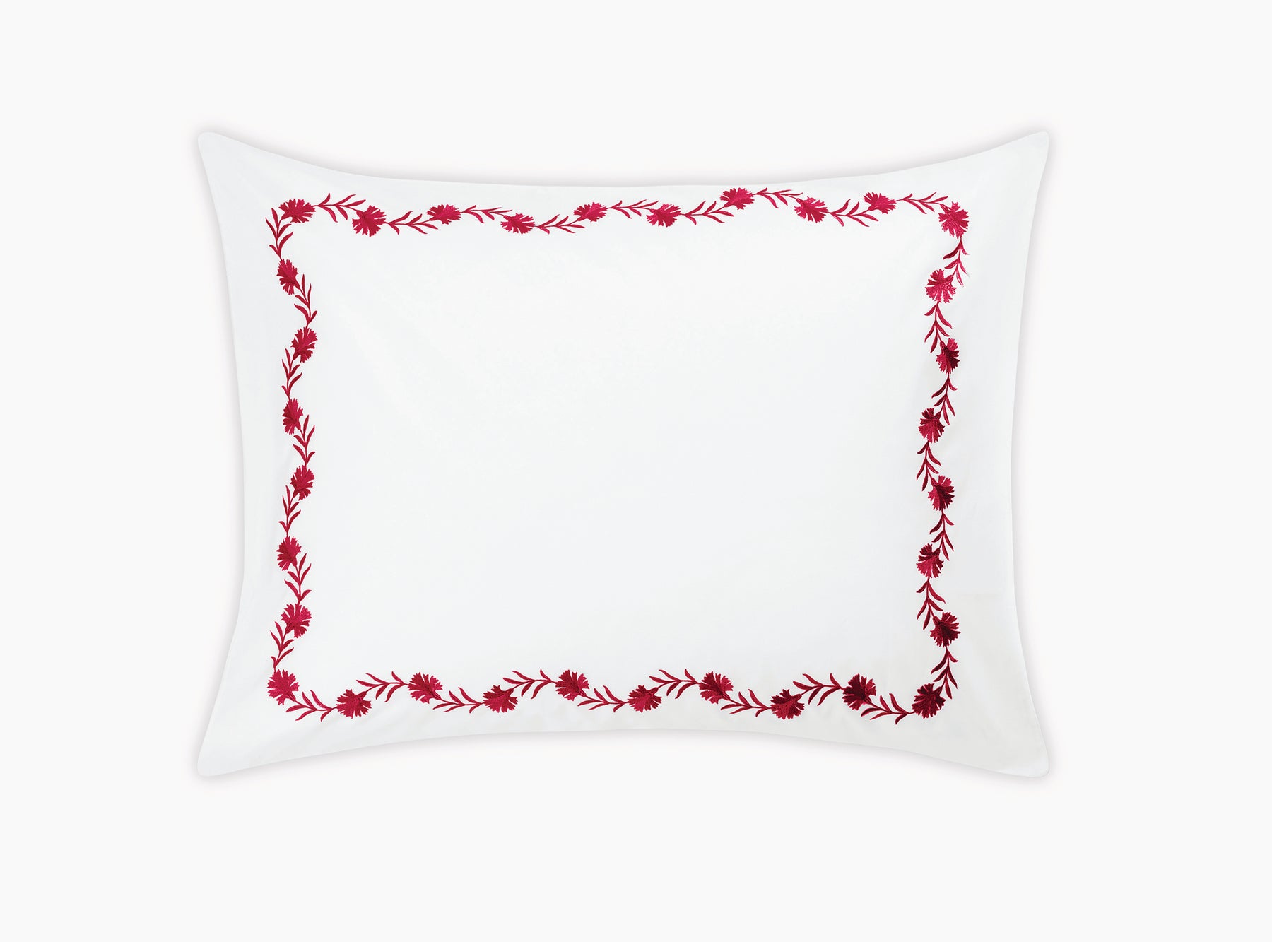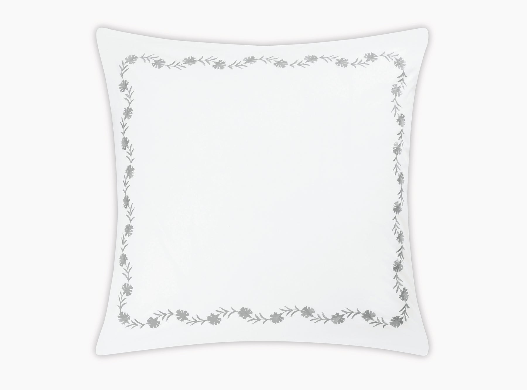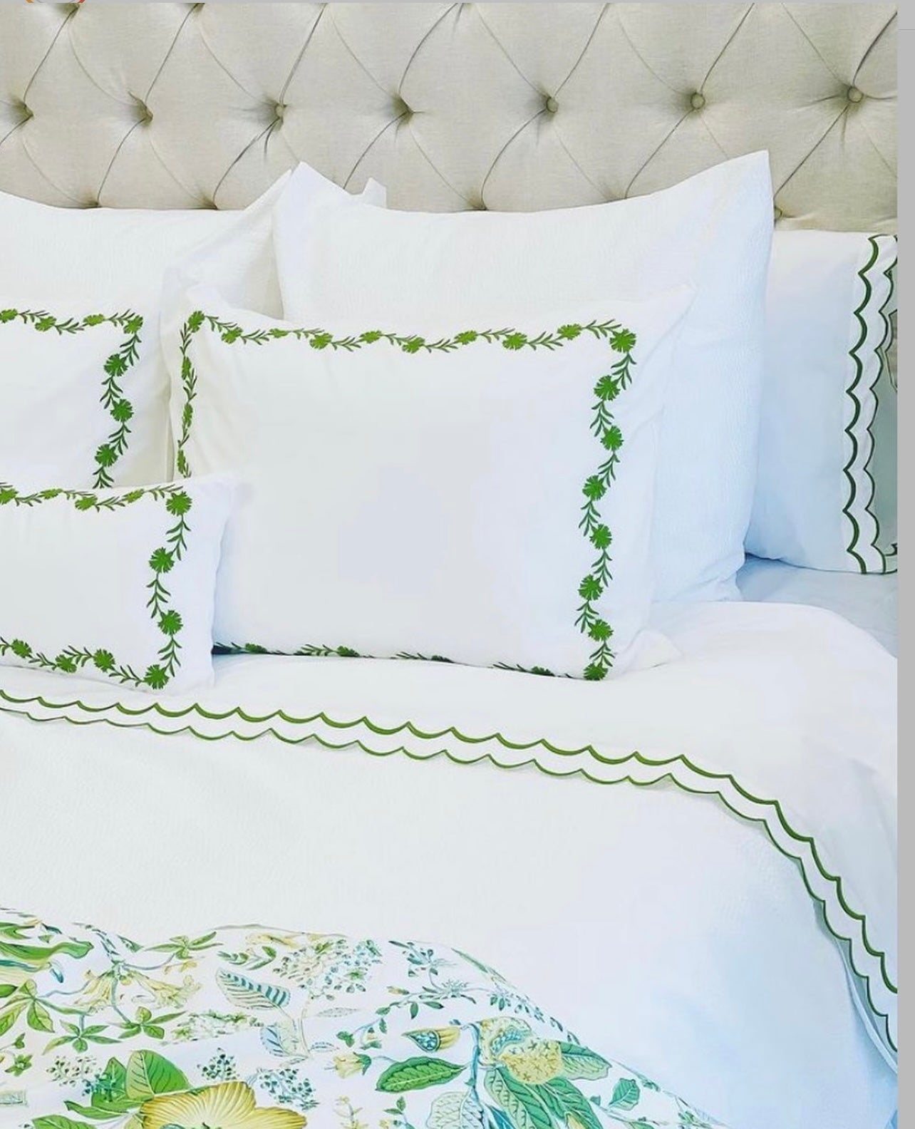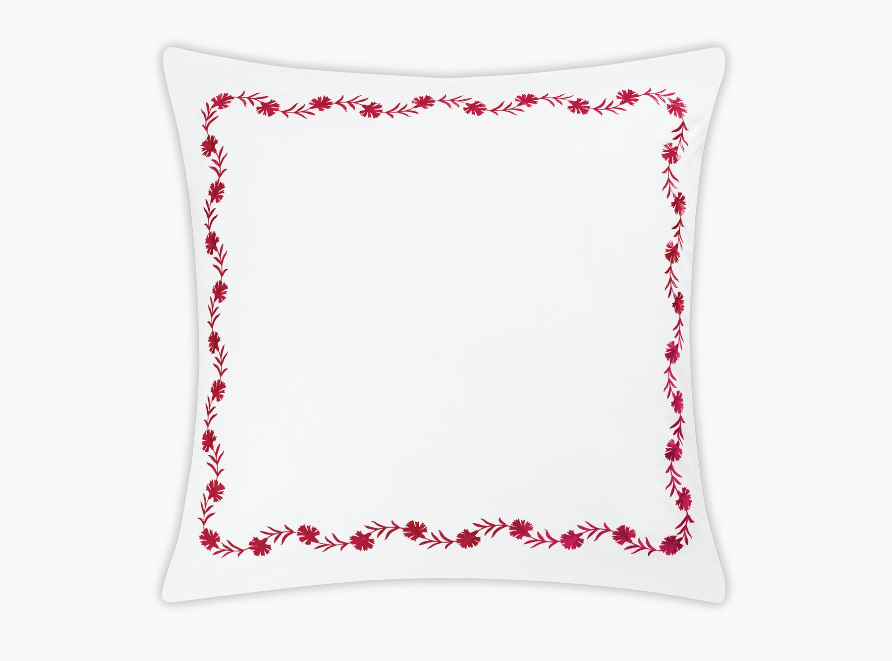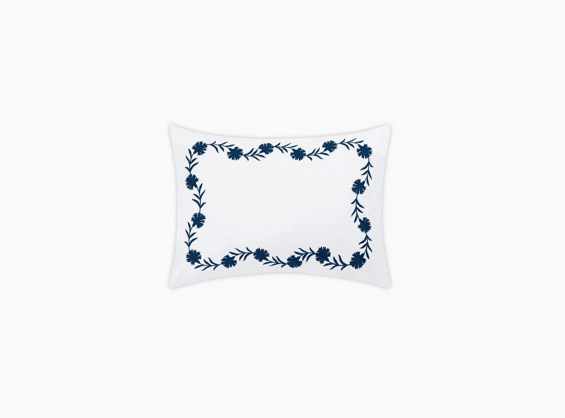 Daphne’s embroidered floral vine is a beautifully crafted detail that, depending on your choice of thread color, can be quietly classic or vibrant and bold. Made on white 520 thread count Ceylon percale, each piece is finished with a knife edge and delicate white cording.