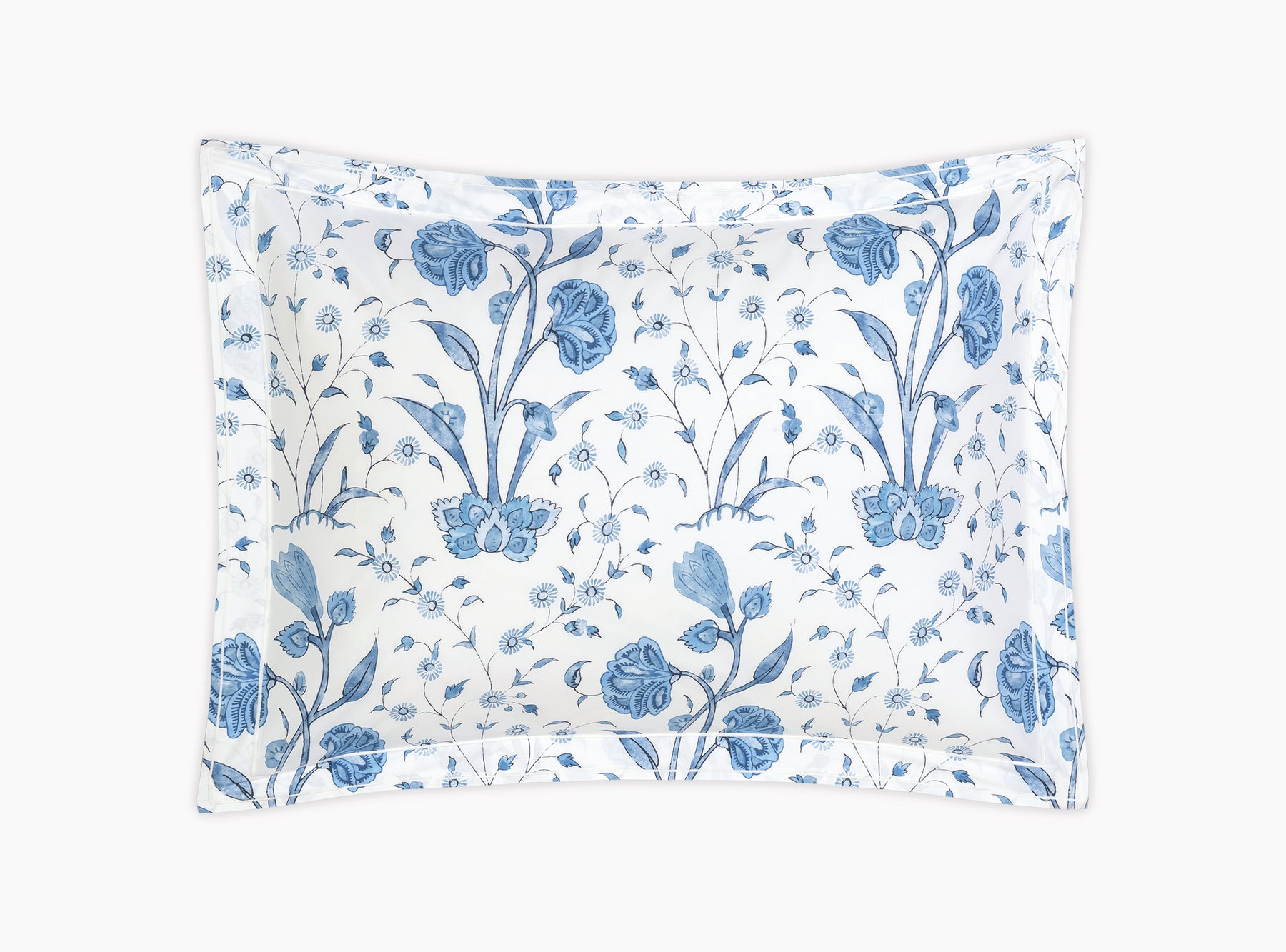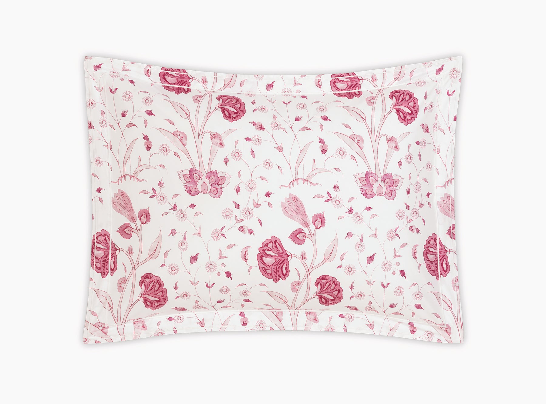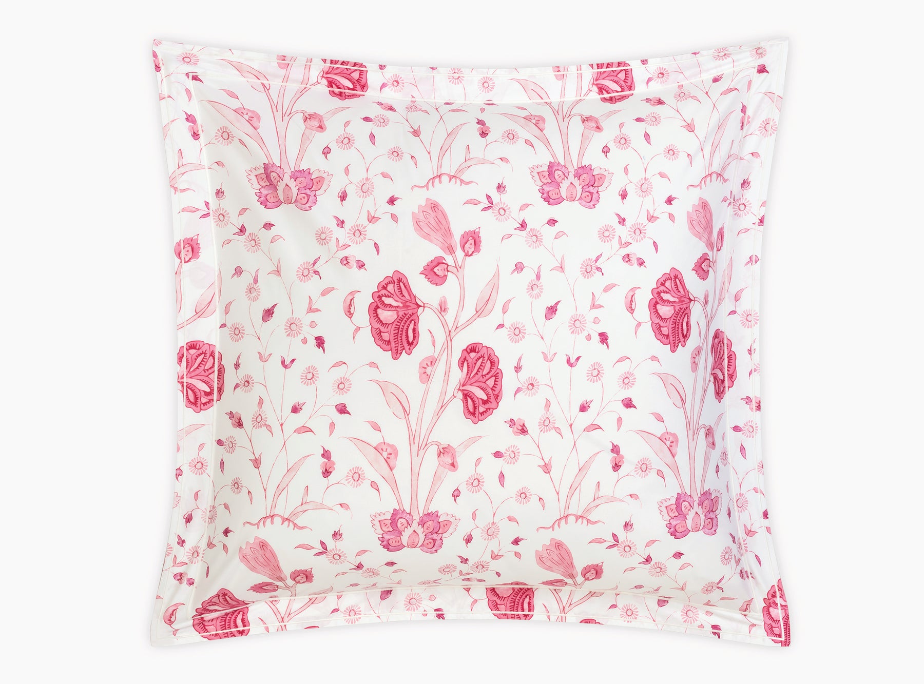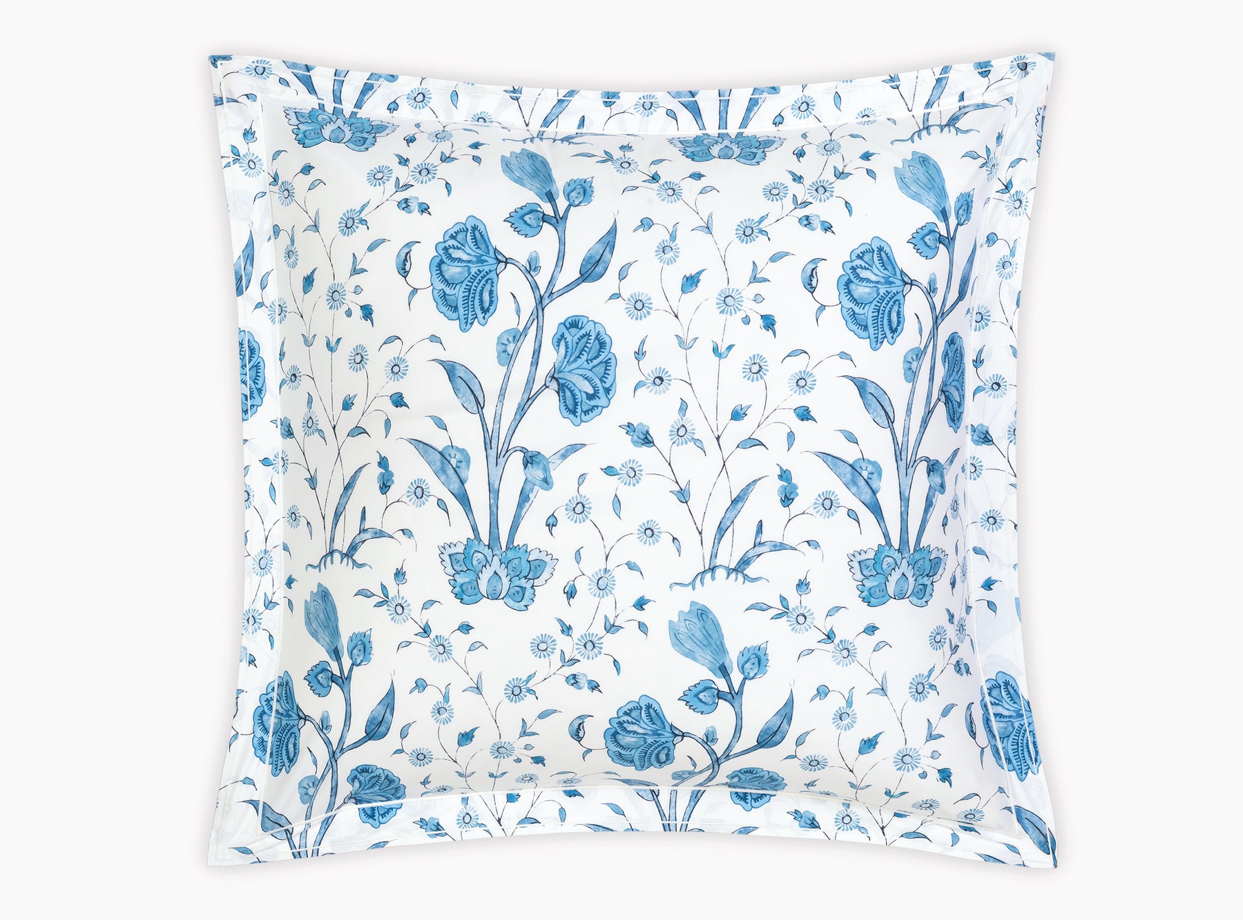 Khilana's large-scale floral print from Schumacher is printed on 500 TC Egyptian cotton percale from Matouk and is finished with a double satin stitch.