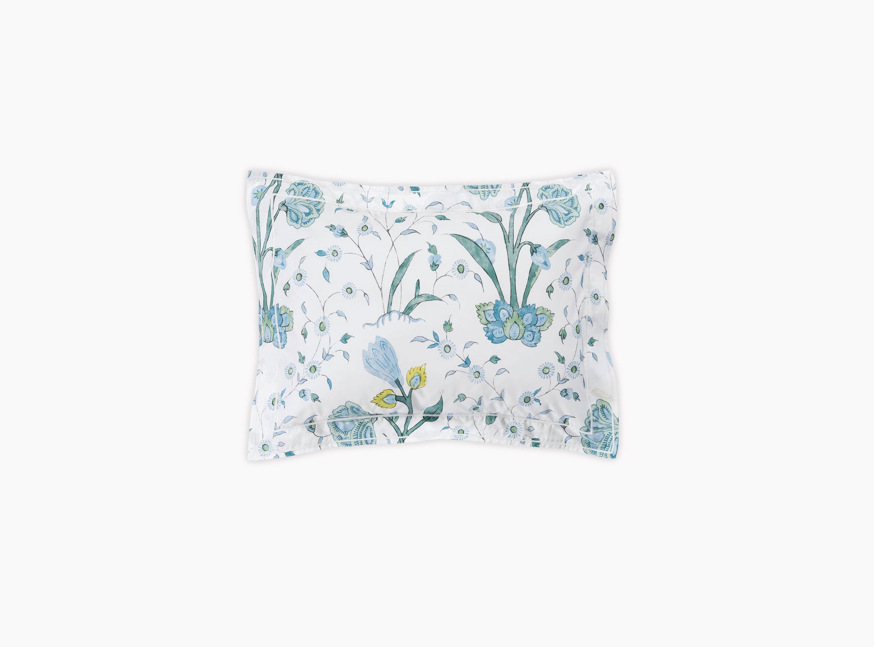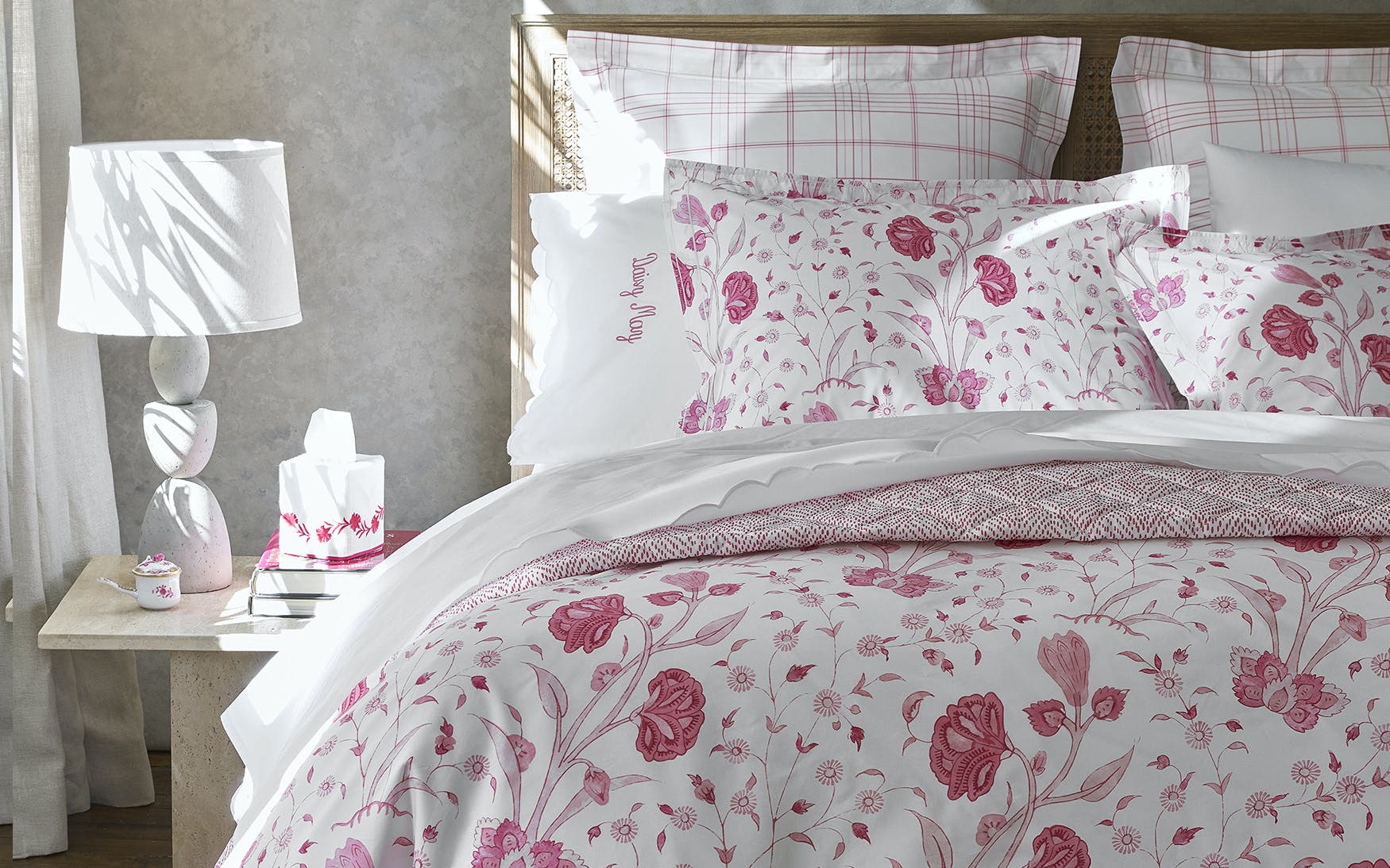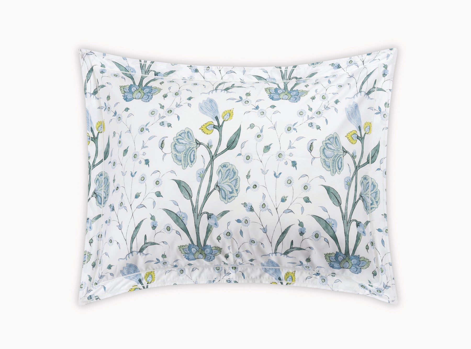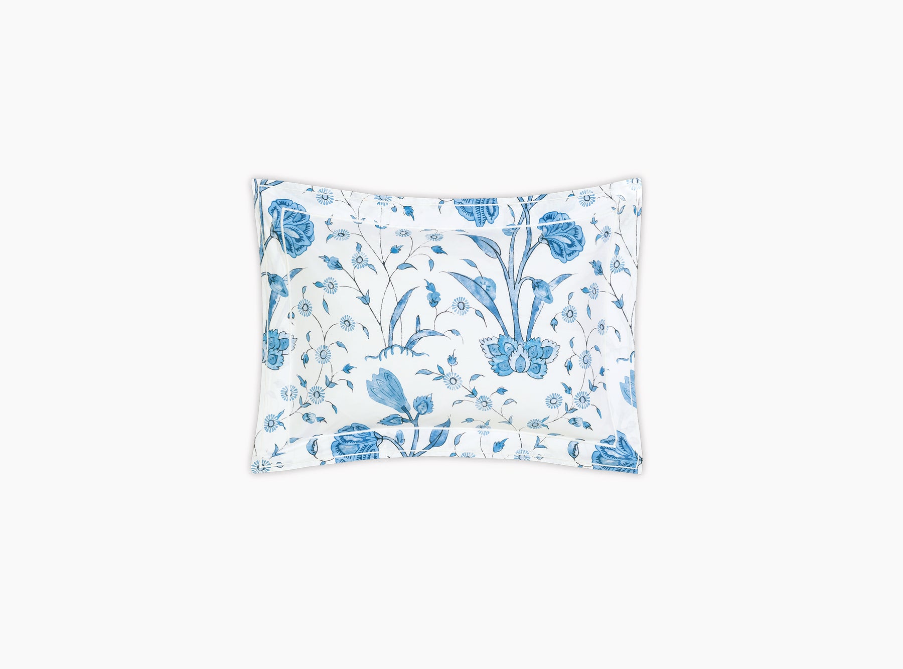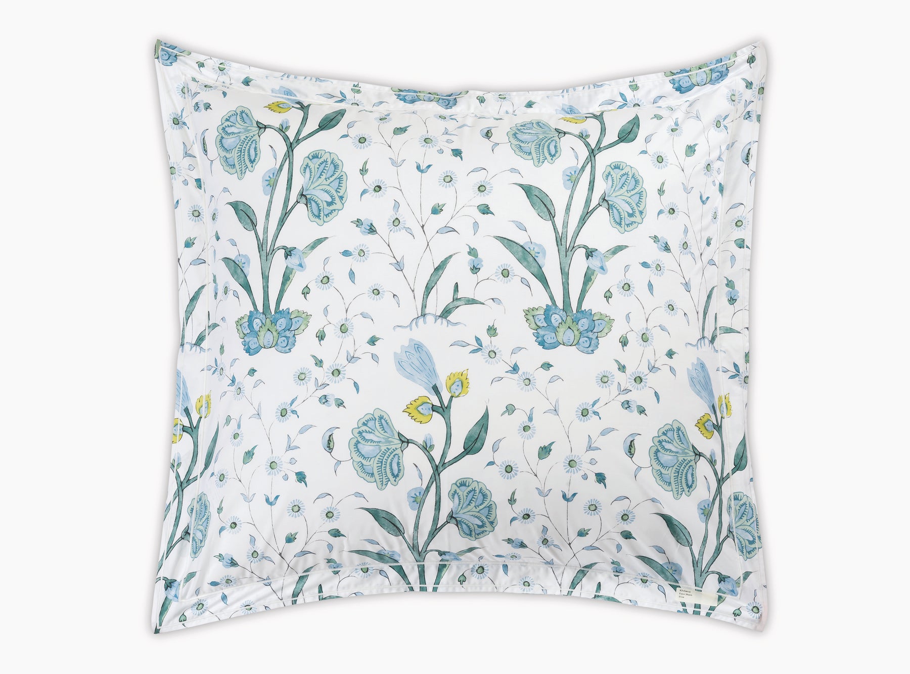 Khilana's large-scale floral print from Schumacher is printed on 500 TC Egyptian cotton percale from Matouk and is finished with a double satin stitch.