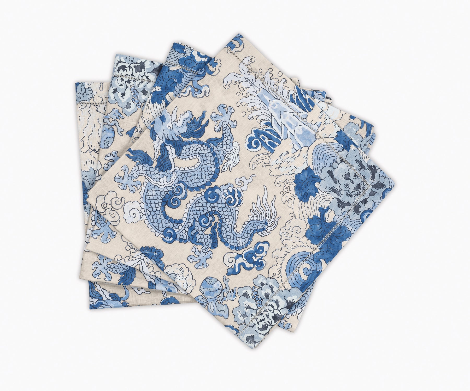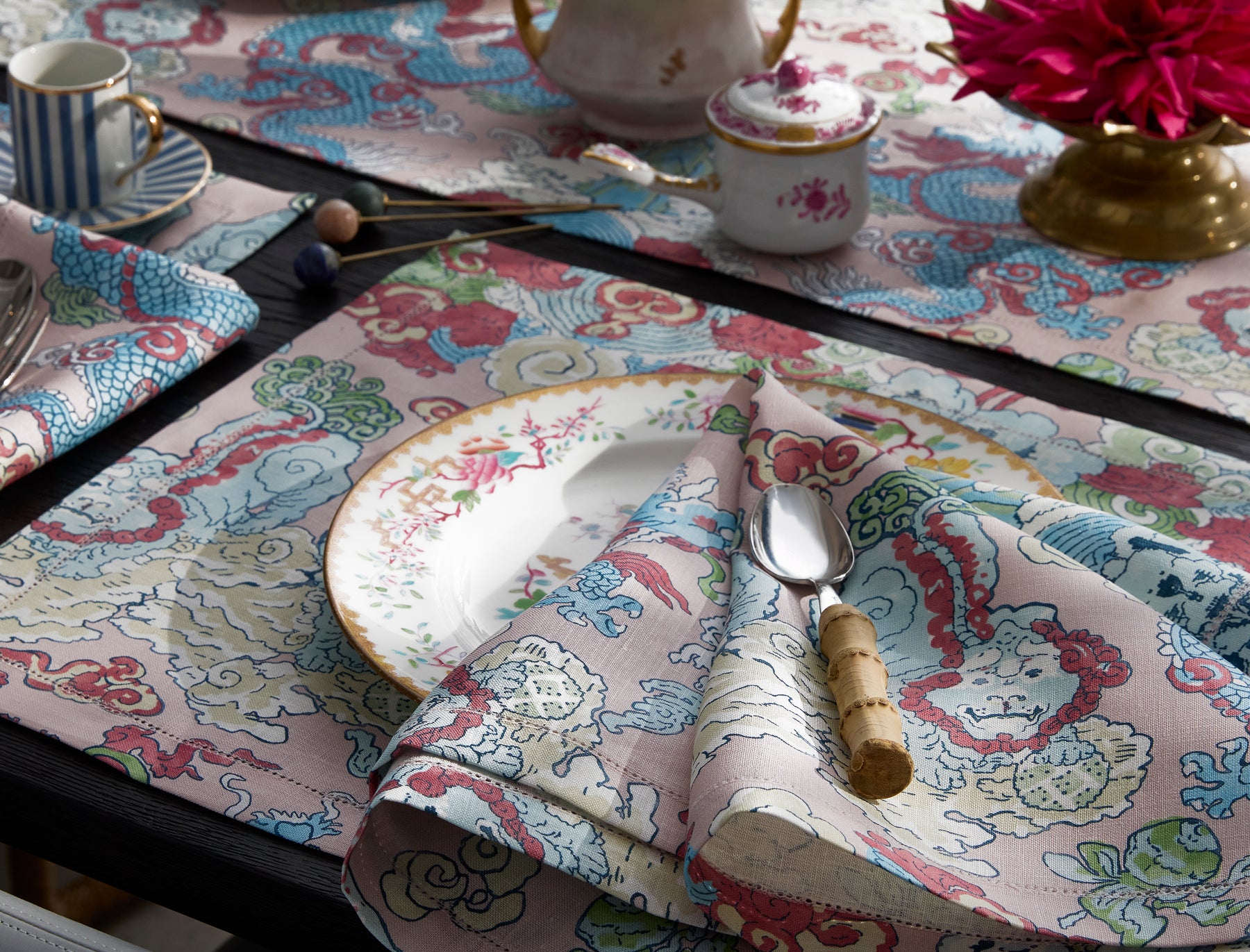 Celebrating the fantastical motifs of ancient myth and legend, Schumacher's Magic Mountain features a psychedelic formation of foo dogs and fire-breathing dragons. Printed in Portugal on our signature tale linen, this is a collection designed to make a statement- the perfect backdrop for both special occasions and everyday dining.