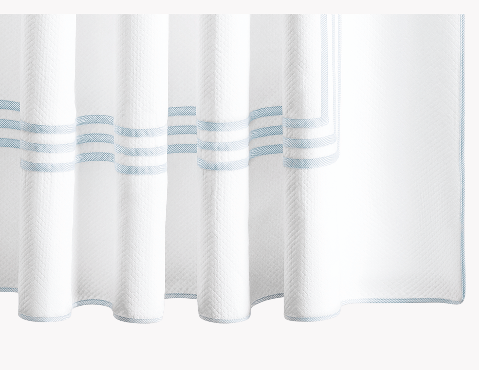 With the addition of triple applique tape border, the white diamond pique becomes the Newport Shower Curtain. Tape detailing available in 8 different colors.