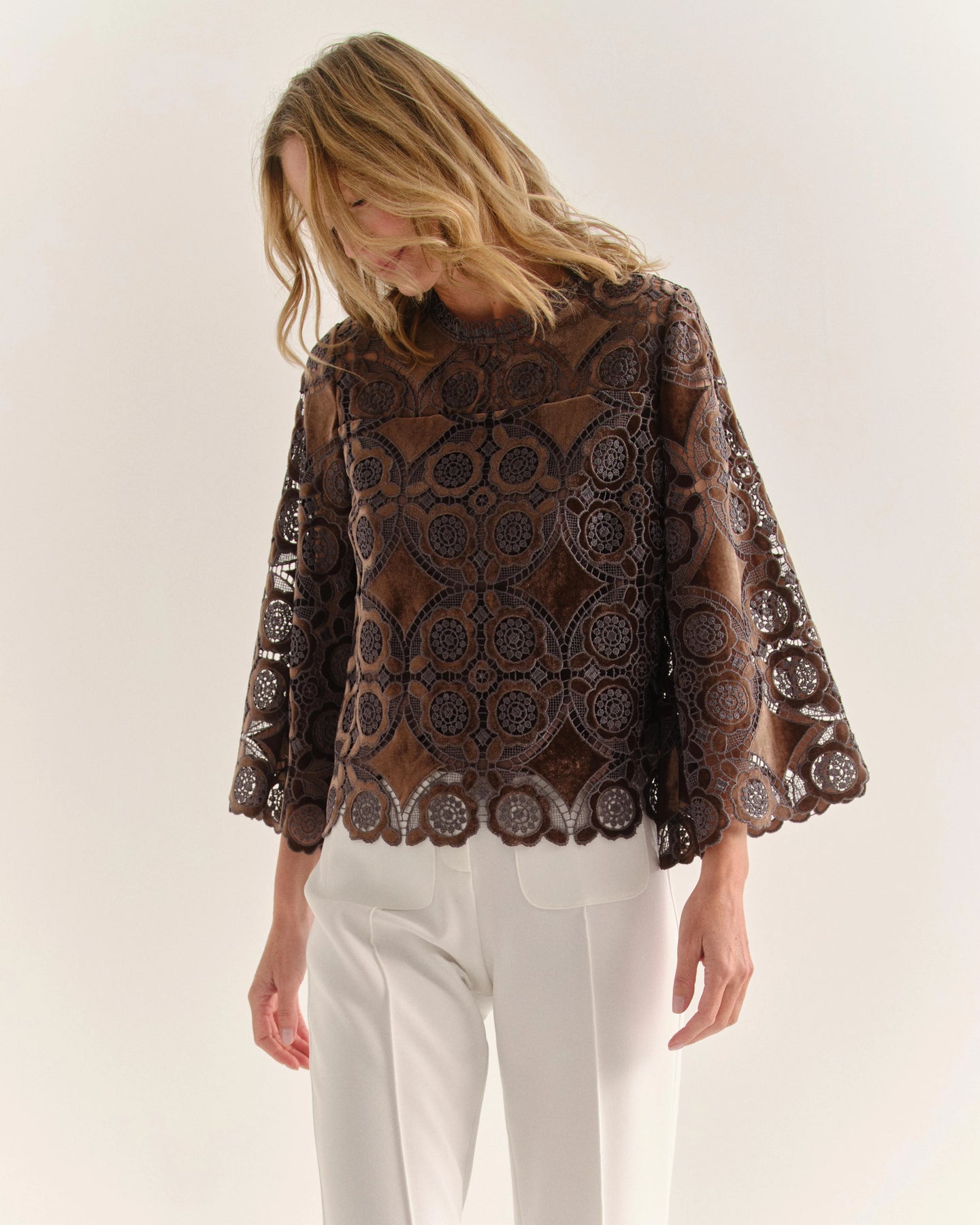 This velvet lace style is designed for occasions when subtle allure makes the strongest statement. Scalloped trims and airy sleeves lend an ethereal finish that feels both effortless and refined.