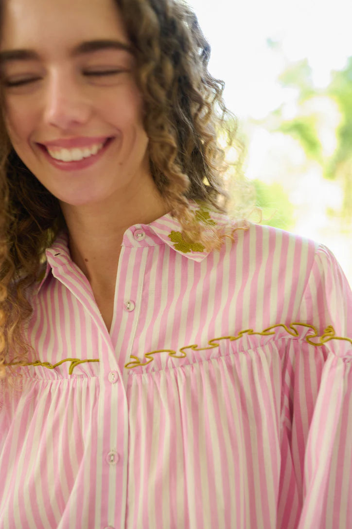 Effortless elegance meets everyday comfort with the Frankie Blouse in Pink Stripe. This versatile piece features a classic striped pattern that transitions seamlessly from office to weekend. The relaxed fit and breathable fabric make it perfect for layering or wearing solo. A timeless wardrobe staple that pairs with everything from tailored trousers to your favorite jeans.