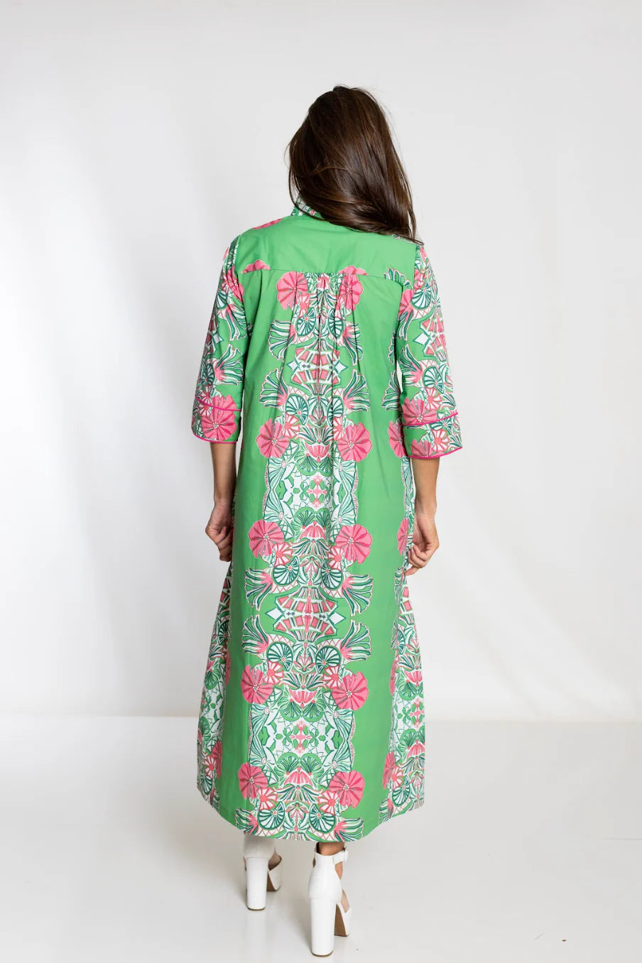 Meet Jade Garden. Green and pink delight in a centered parade of florals on our signature bouvier cut caftan. Made of an easy cotton to take you through the season.