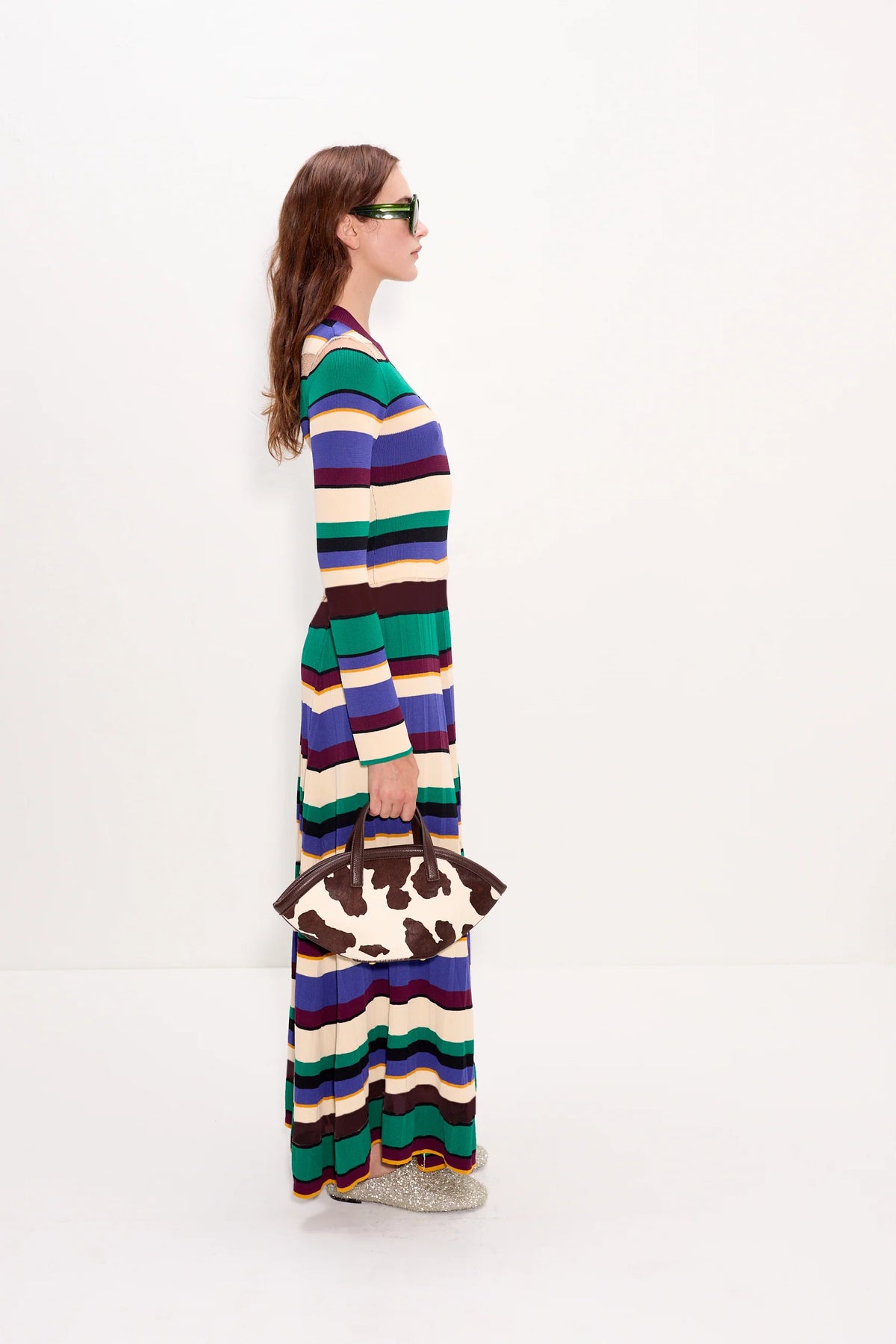 Maxi-length long sleeve knit dress featuring multicolor tropical stripes. Designed with a fitted bodice and pleated skirt for a flattering drape below the waist.