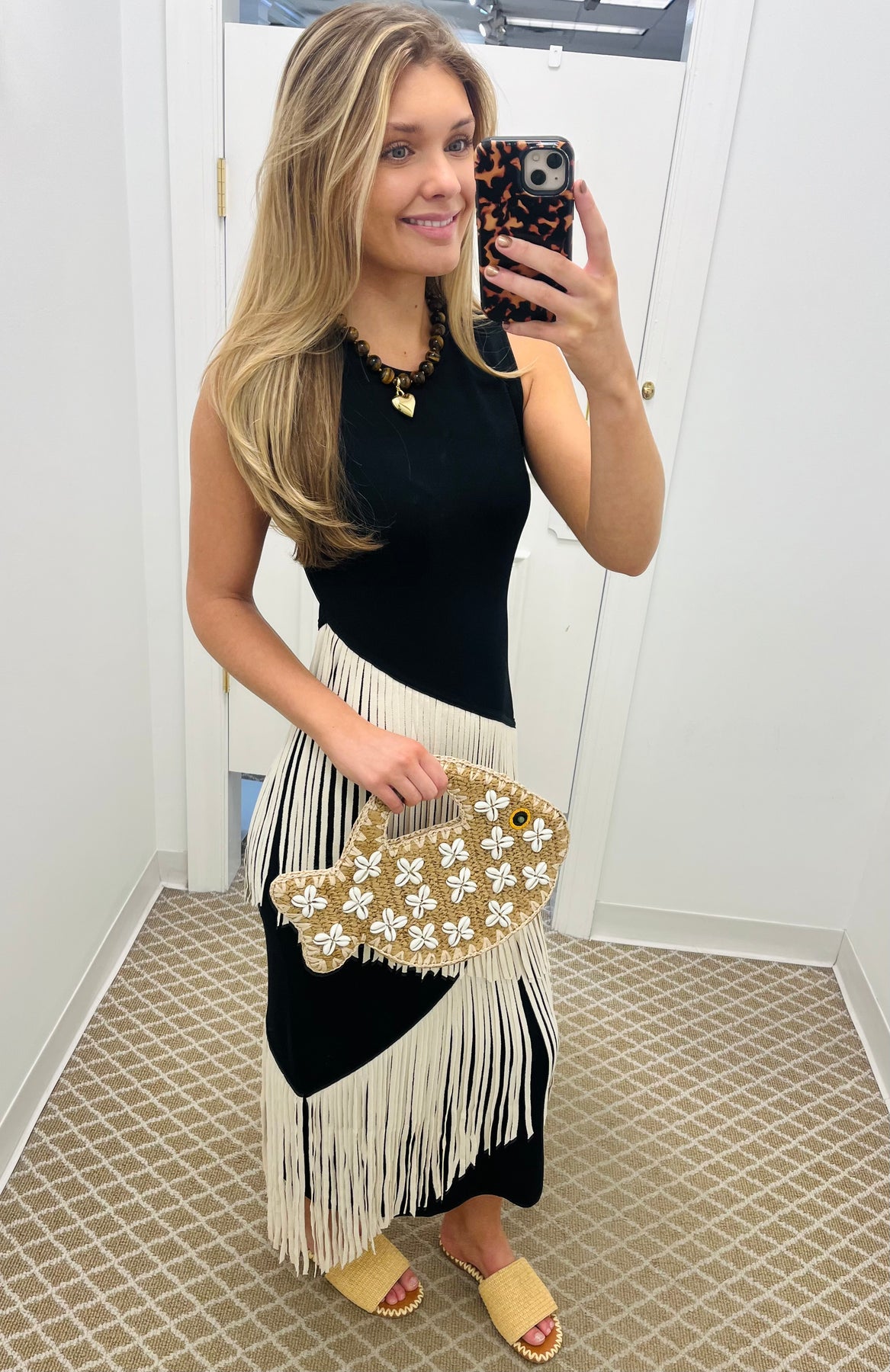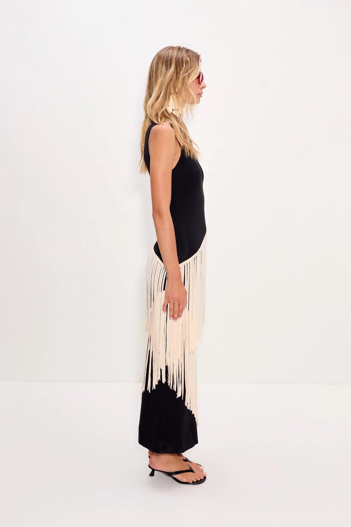Long knit dress in black and macadamia with a body-skimming silhouette. Features a spiral striped pattern and lightweight stretch for an easy, flattering fit.