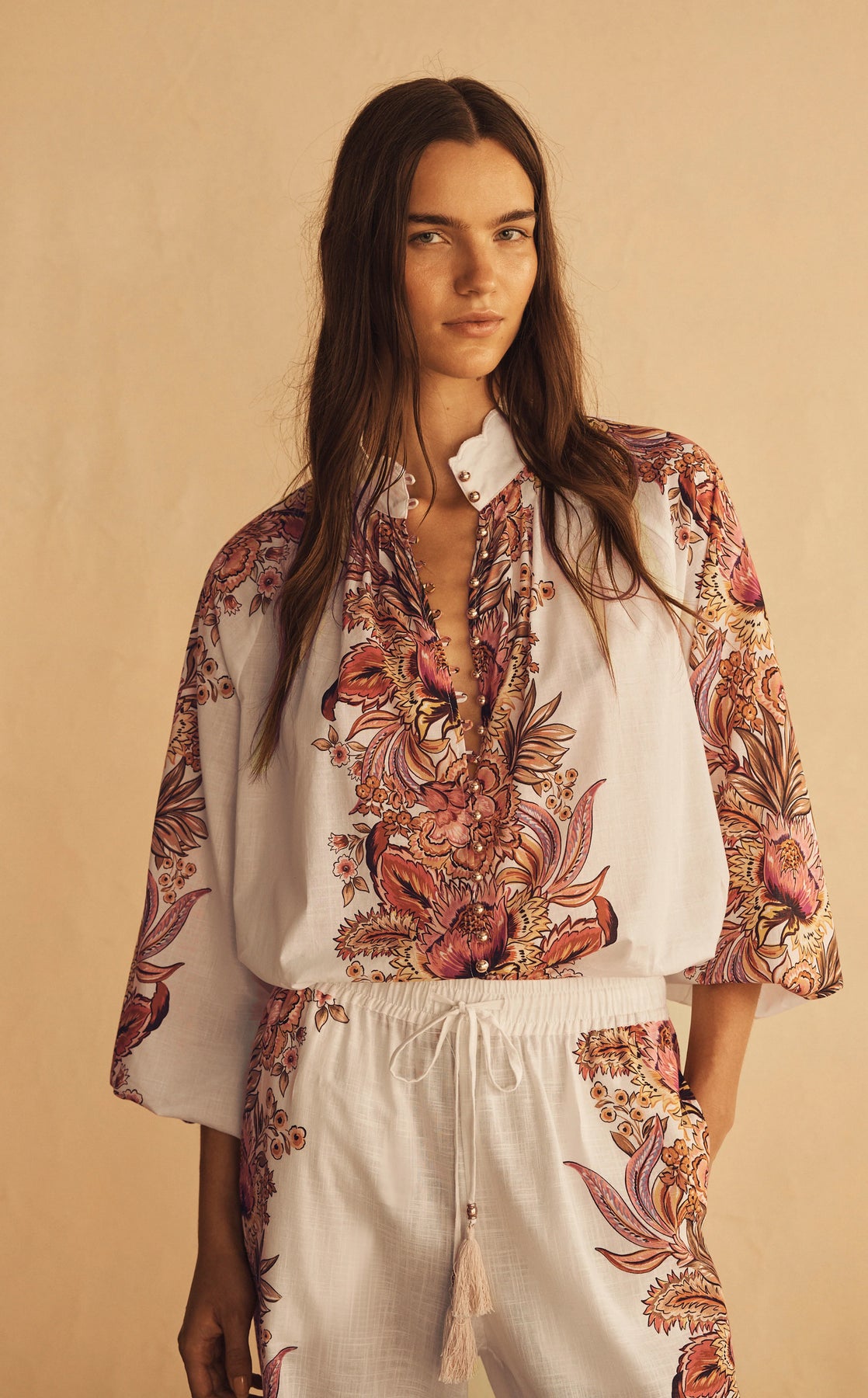 A wardrobe staple, the Scallop Billow Sleeve Blouse is a versatile foundation piece. Crafted from a lightweight, breathable cotton fabric featuring gold dome button down centre front, scalloped collared neckline and billow sleeves. Wear unbuttoned over your swimsuit or style with matching Straight Leg Pant to complete this look.