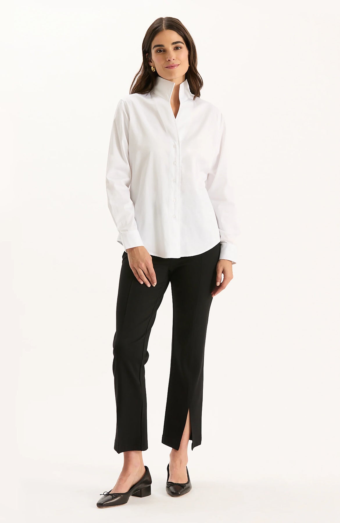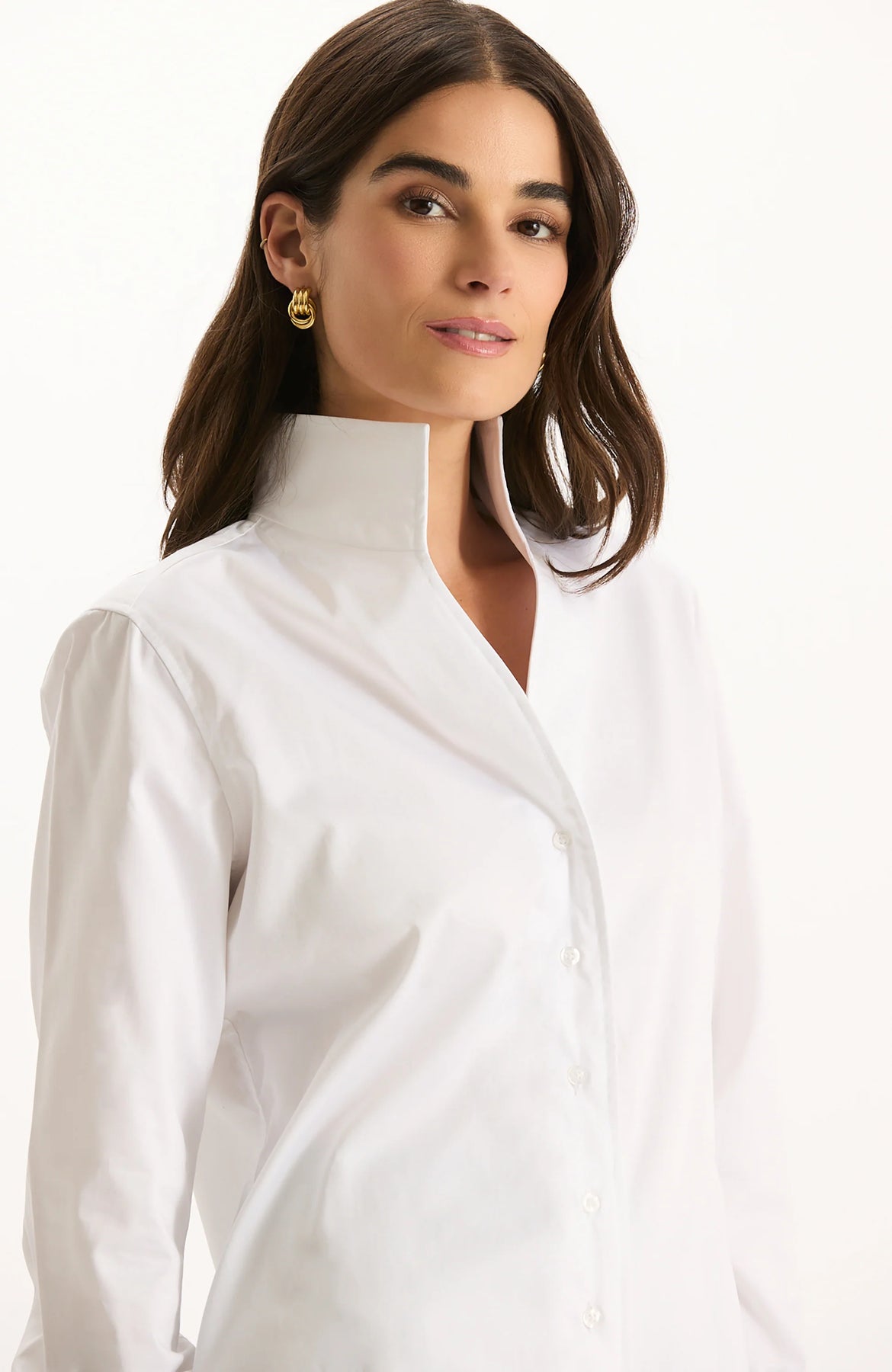A seasonal staple and must-add piece to your wardrobe. This shirt features a sleek stand collar and tailored silhouette, making it the perfect base layer. Wear it solo for a crisp, clean look or under your favorite blazer or sweater for polished, all-season style.