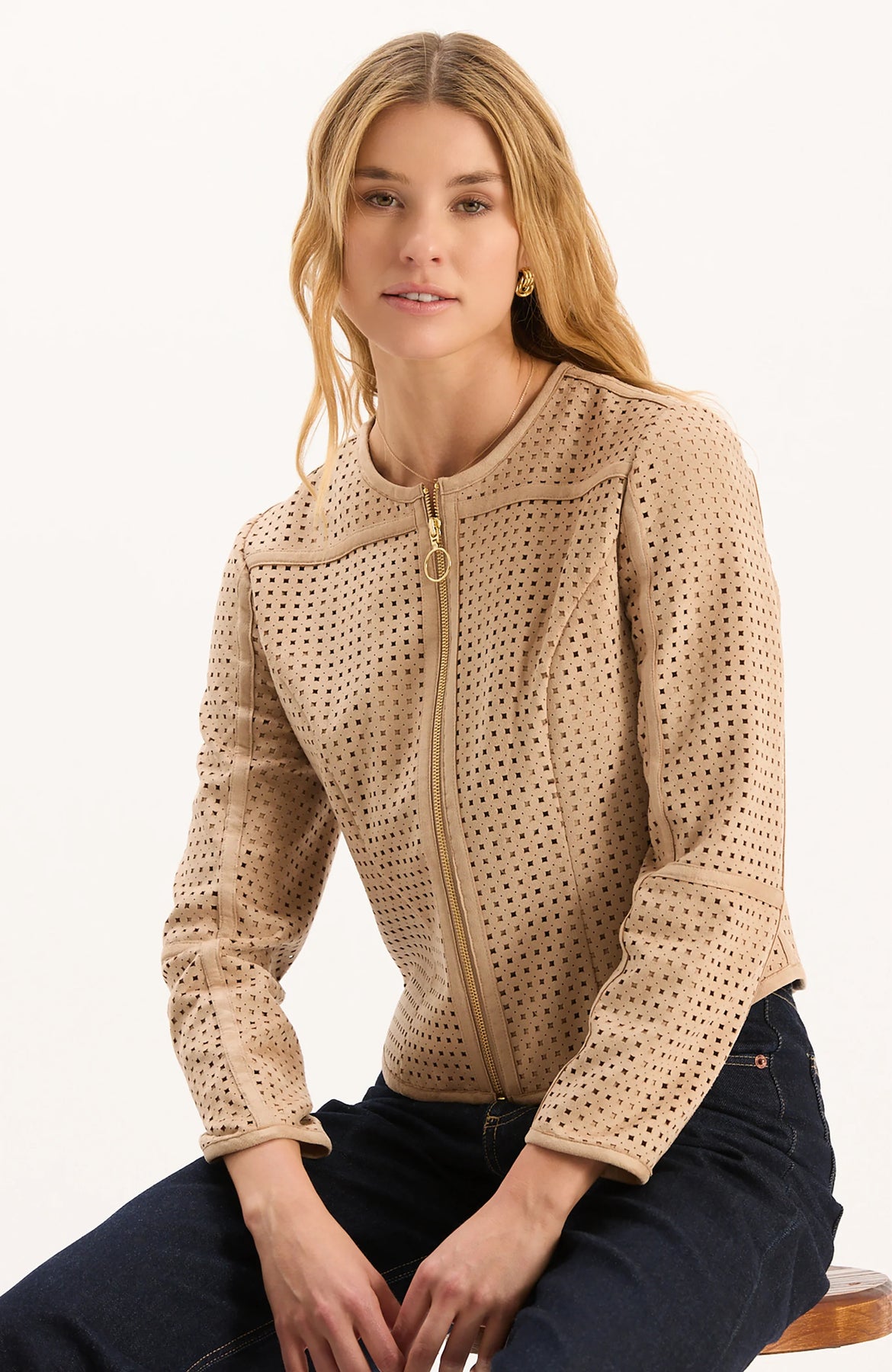Crafted in soft faux suede fabric, the Piper Punched Faux Suede Jacket has a luxurious feel and contemporary edge. The silhouette features a collarless design, gold zip-front closure, and allover perforated detailing that adds textural interest and modern flair. Perfect for pairing with everything from jeans to dresses, it brings just the right amount of polish to any outfit.