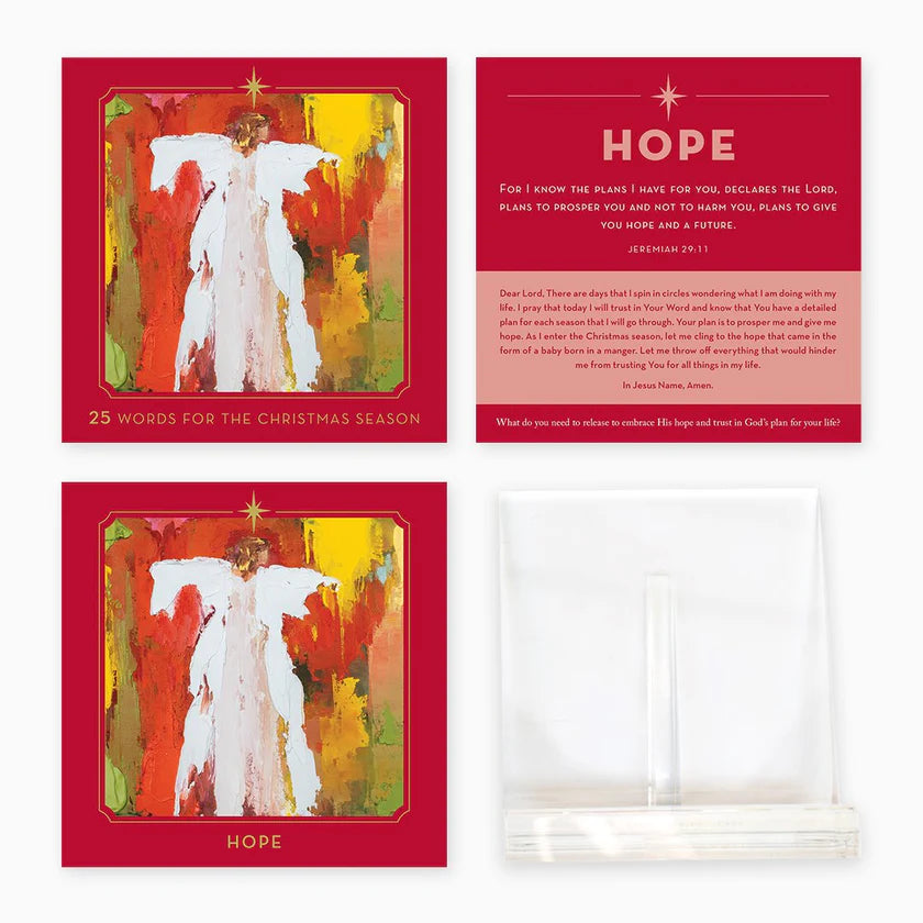 Our 25 Words For The Christmas Season is the perfect way to prepare your heart for the Christmas season, and features new Angel artwork with bright and festive colors. Each advent card has a chosen word, a scripture verse, and prayer reflection to keep you focused on the true meaning of the season. These 6x6 inch cards are shrink-wrapped and packaged in an Anne Neilson Home cloth bag accompanied by an acrylic display stand.