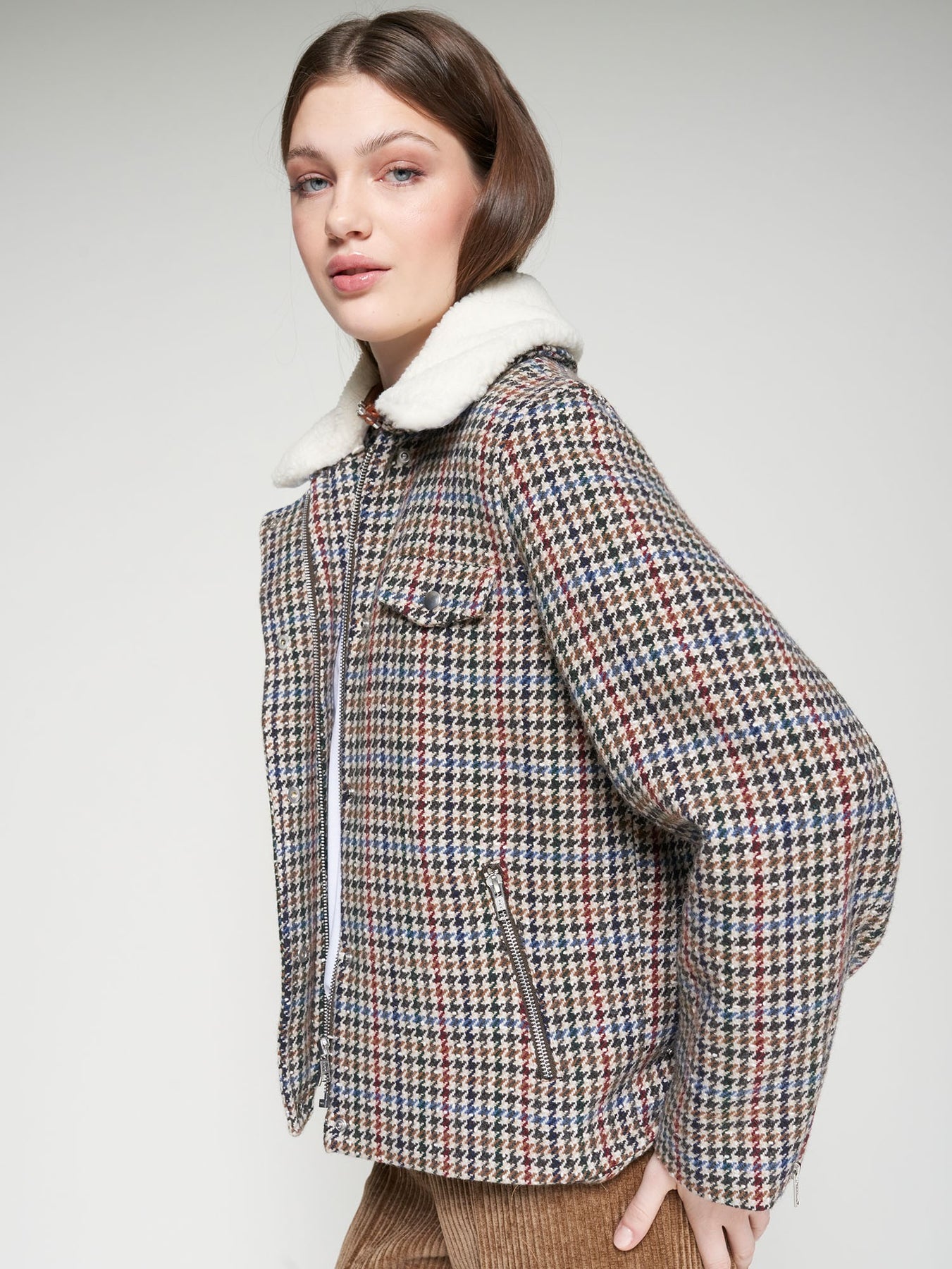 Short houndstooth jacket in multicolored tones over a brown base. Removable white shearling collar. Metal front zip. One flap pocket on the chest and two side zip pockets. Lined in a printed fabric featuring equestrian motifs. Structured fabric in a blend including wool.