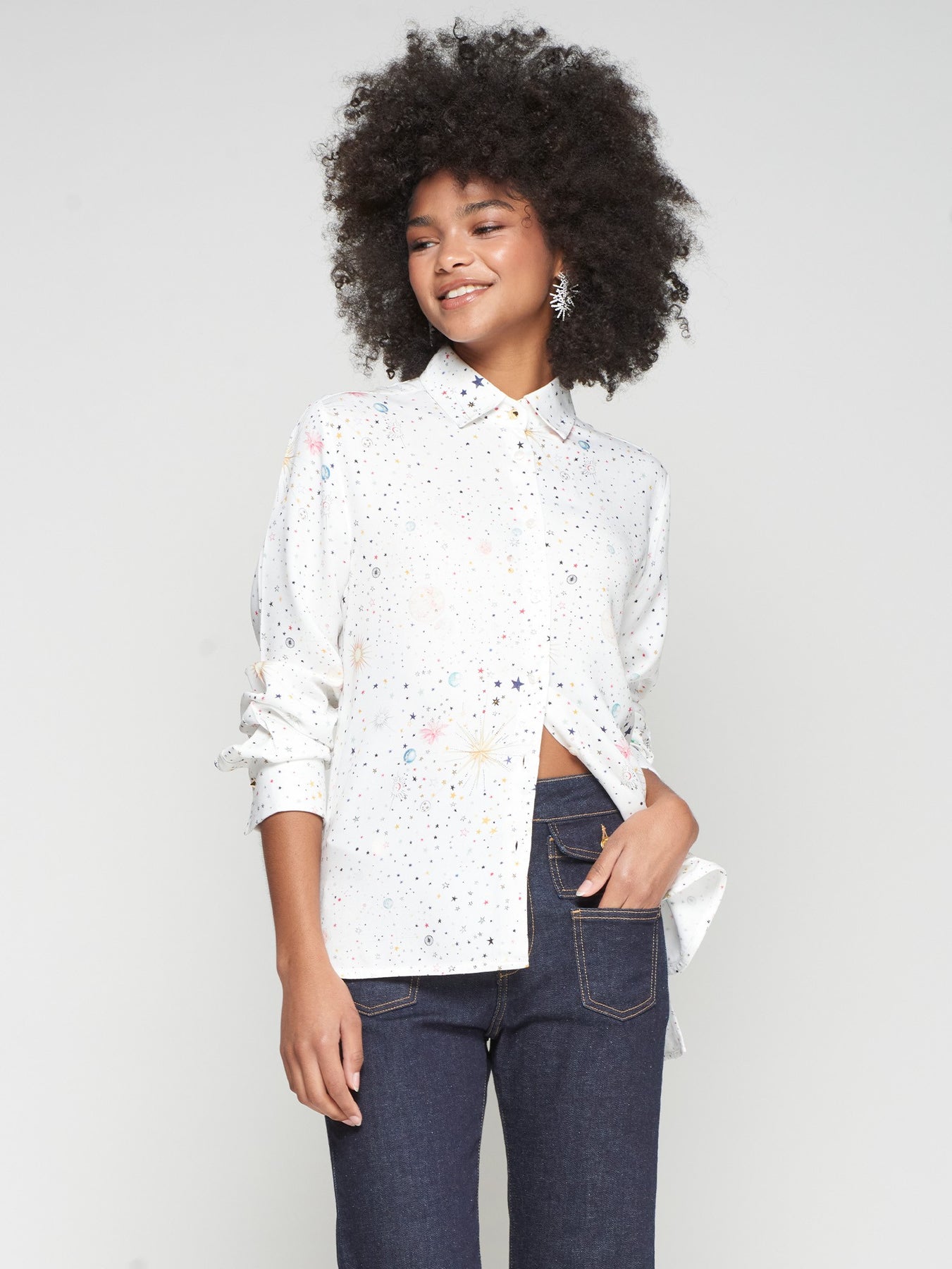 White viscose shirt with multicolour cosmic print and exclusive Vilagallo building placement print on the back. Straight cut, classic shirt collar, long sleeves with buttoned cuffs and slightly rounded hem.