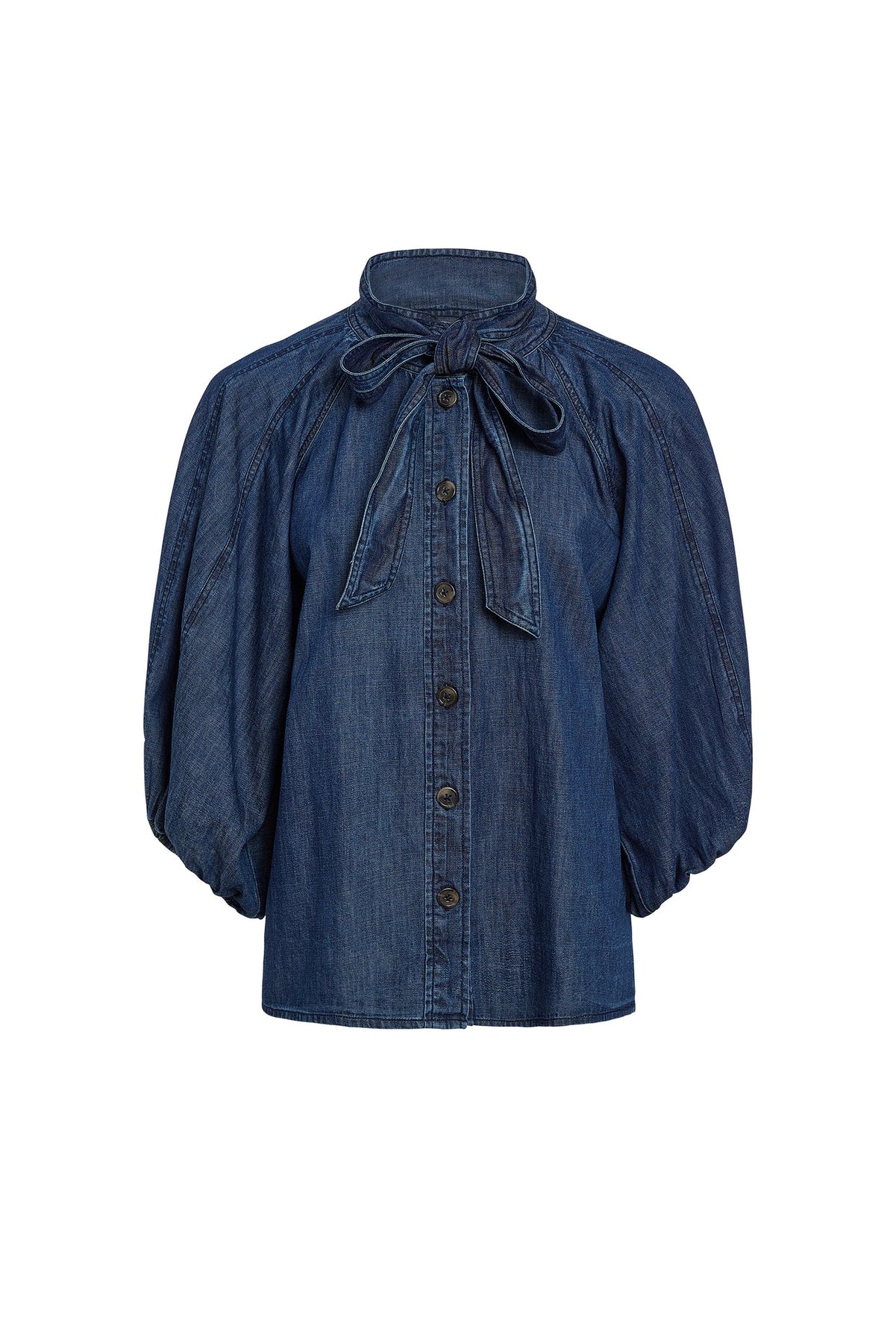 Featuring dramatically puffed sleeves, an optional tie at the neck, delicate stitch detailing, and a pretty button-front placket, our Navi top in midnight blue chambray brings an elegant touch of punk-rock femininity to the tailored Crawford mini skirt, pictured here in tonal navy denim. It’s a refined, modern take on denim-on-denim dressing.